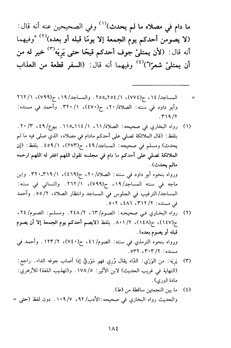ما دام في مصلاه ما لم يحدث وفي الصحيحين عنه أنه قال لا يصومن أحدكم يوم الجمعة إلا يومًا قبله أو بعده وفيهما أنه قال لأن يمتلئ جوف أحدكم قيحًا حتى يَرِيَه خير له من أن يمتلئ شعرًا وفيهما أنه قال السفر قطعة من العذاب