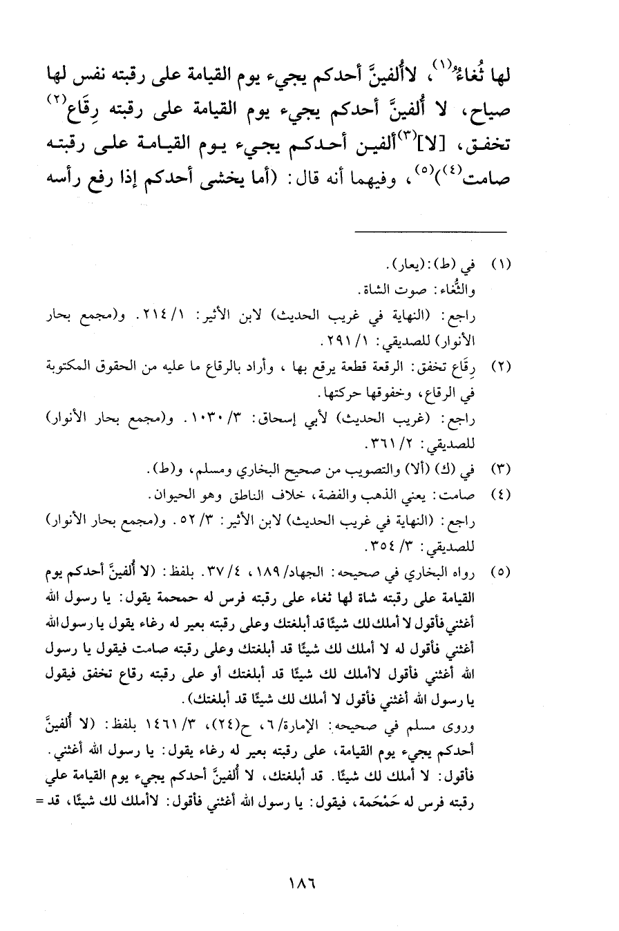 لها ثُغاءٌ لاأُلفينَّ أحدكم يجيء يوم القيامة على رقبته نفس لها صياح لا أُلفينَّ أحدكم يجيء يوم القيامة على رقبته رِقَاع تخفق لا ألفين أحدكم يجيء يوم القيامة على رقبته صامت وفيهما أنه قال أما يخشى أحدكم إذا رفع رأسه
