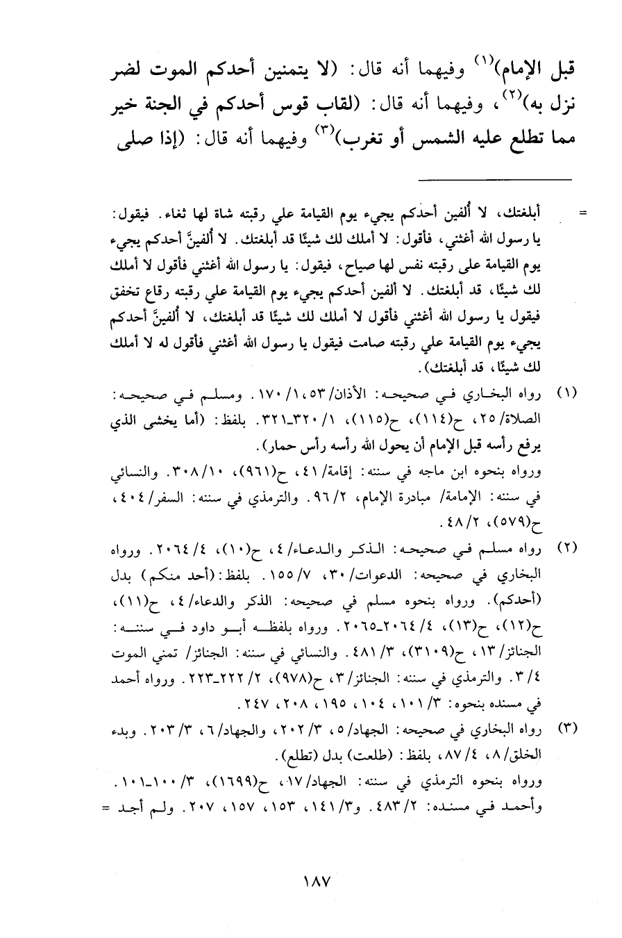 قبل الإمام وفيهما أنه قال لا يتمنين أحدكم الموت لضر نزل به وفيهما أنه قال لقاب قوس أحدكم في الجنة خير مما تطلع عليه الشمس أو تغرب وفيهما أنه قال إذا صلى