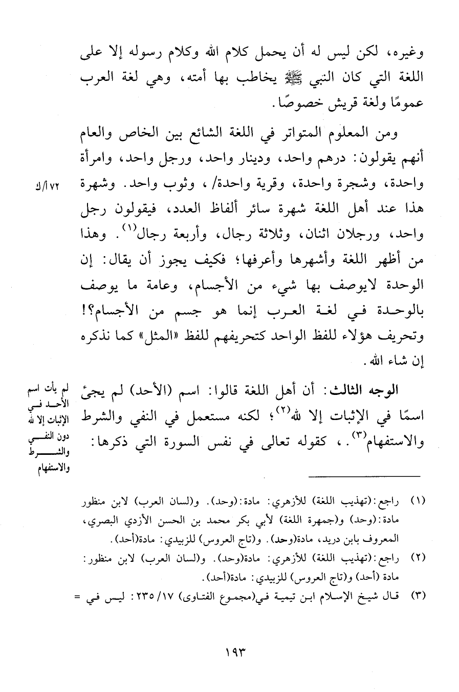 وغيره لكن ليس له أن يحمل كلام الله وكلام رسوله إلا على اللغة التي كان النبي صلى الله عليه وسلم يخاطب بها أمته وهي لغة العرب عمومًا ولغة قريش خصوصًا ومن المعلوم المتواتر في اللغة الشائع بين الخاص والعام أنهم يقولون درهم واحد ودينار واحد ورجل واحد وامرأة واحدة وشجرة واحدة وقرية واحدة وثوب واحد وشهرة هذا عند أهل اللغة شهرة سائر ألفاظ العدد فيقولون رجل واحد ورجلان اثنان وثلاثة رجال وأربعة رجال وهذا من أظهر اللغة وأشهرها وأعرفها فكيف يجوز أن يقال إن الوحدة لايوصف بها شيء من الأجسام وعامة ما يوصف بالوحدة في لغة العرب إنما هو جسم من الأجسام وتحريف هؤلاء للفظ الواحد كتحريفهم للفظ المثل كما نذكره إن شاء الله الوجه الثالث أن أهل اللغة قالوا اسم الأحد لم يجئ اسمًا في الإثبات إلا لله لكنه مستعمل في النفي والشرط والاستفهام كقوله تعالى في نفس السورة التي ذكرها