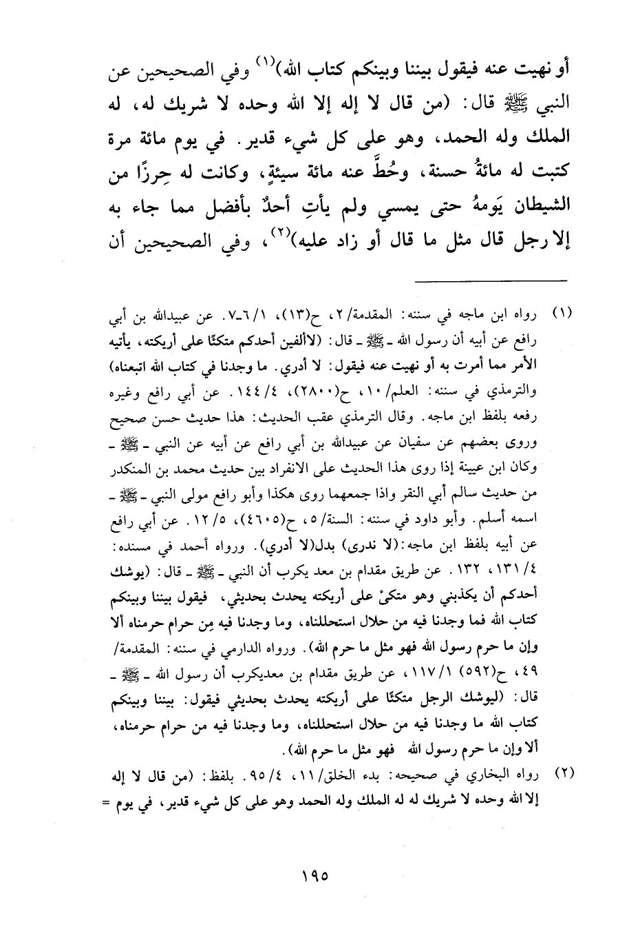أو نهيت عنه فيقول بيننا وبينكم كتاب الله وفي الصحيحين عن النبي صلى الله عليه وسلم قال من قال لا إله إلا الله وحده لا شريك له له الملك وله الحمد وهو على كل شيء قدير في يوم مائة مرة كتبت له مائةُ حسنة وحُطَّ عنه مائة سيئةٍ وكانت له حِرزًا من الشيطان يَومهُ حتى يمسي ولم يأتِ أحدٌ بأفضل مما جاء به إلا رجل قال مثل ما قال أو زاد عليه وفي الصحيحين أن