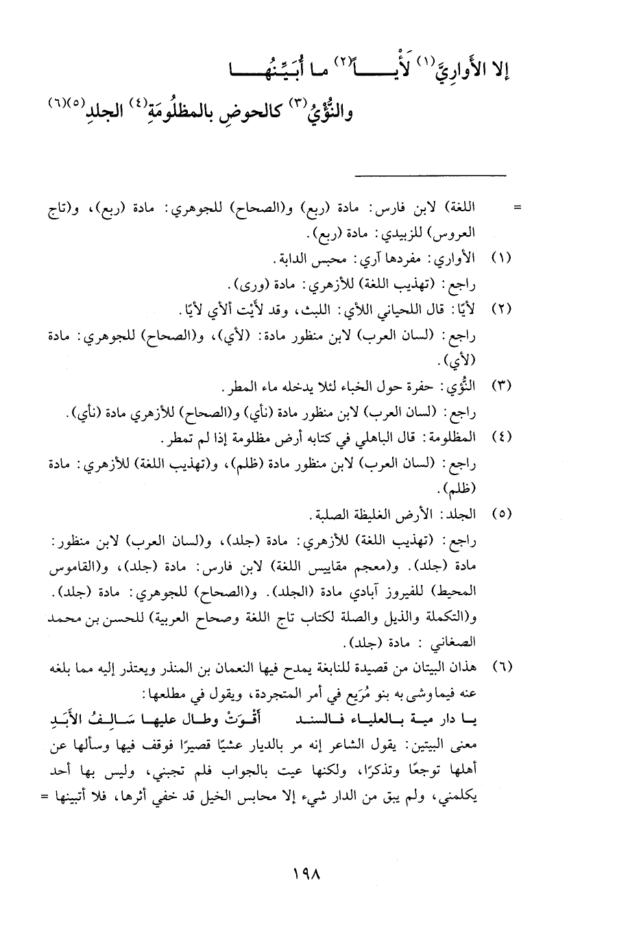 إلا الأَوارِيَّ لَأْياً ما أُبَيِّنُها والنُّؤْيُ كالحوضِ بالمظلُومَةِ الجلدِ