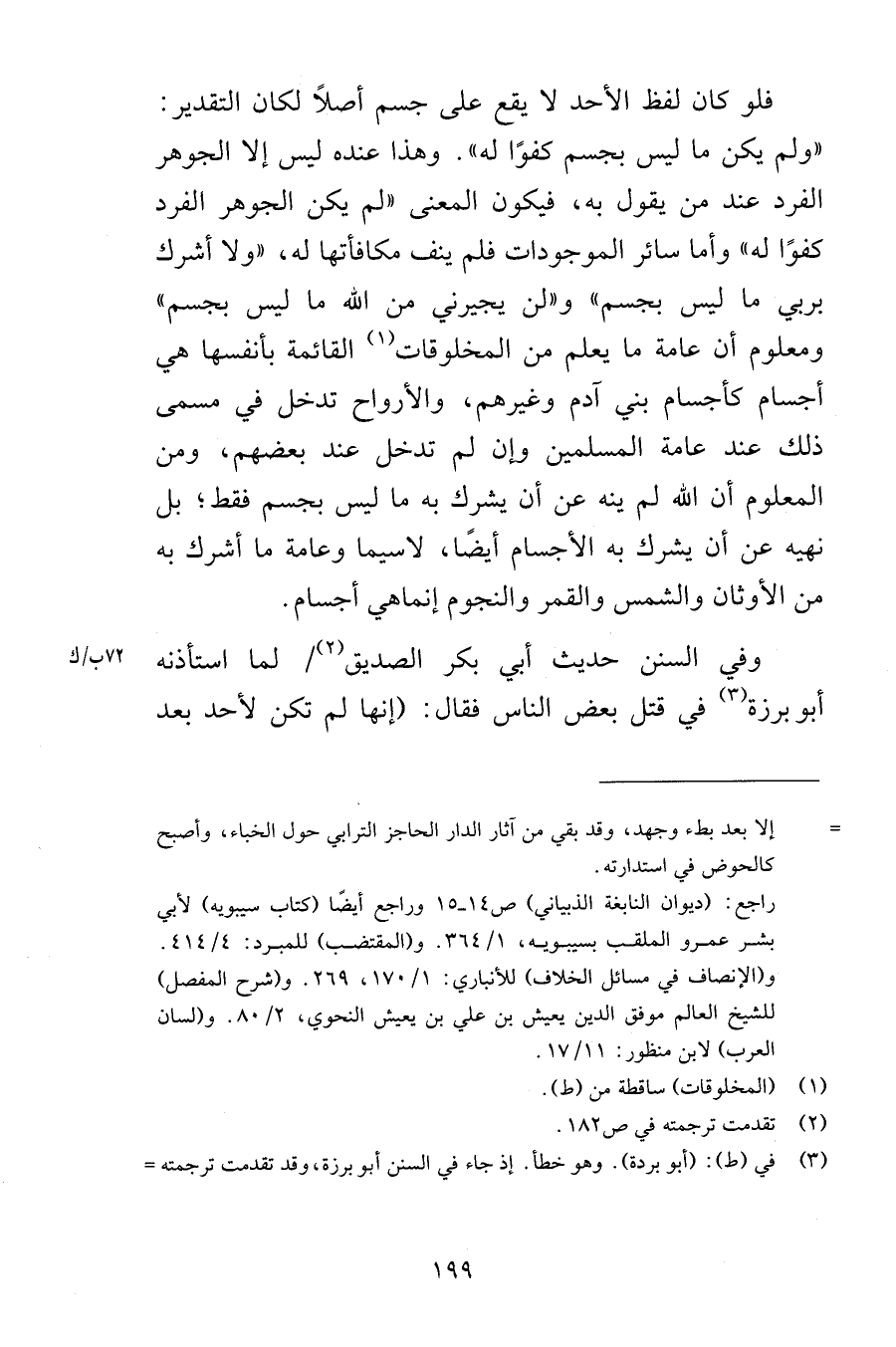 فلو كان لفظ الأحد لايقع على جسم أصلاً لكان التقدير ولم يكن ما ليس بجسم كفوًا له وهذا عنده ليس إلا الجوهر الفرد عند من يقول به فيكون المعنى لم يكن الجوهر الفرد كفوًا له وأما سائر الموجودات فلم ينف مكافأتها له ولا أشرك بربي ما ليس بجسم ولن يجيرني من الله ما ليس بجسم ومعلوم أن عامة ما يعلم من المخلوقات القائمة بأنفسها هي أجسام كأجسام بني آدم وغيرهم والأرواح تدخل في مسمى ذلك عند عامة المسلمين وإن لم تدخل عند بعضهم ومن المعلوم أن الله لم ينه عن أن يشرك به ما ليس بجسم فقط بل نهيه عن أن يشرك به الأجسام أيضًا لاسيما وعامة ما أشرك به من الأوثان والشمس والقمر والنجوم إنماهي أجسام وفي السنن حديث أبي بكر الصديق لما استأذنه أبو برزة في قتل بعض الناس فقال إنها لم تكن لأحد بعد