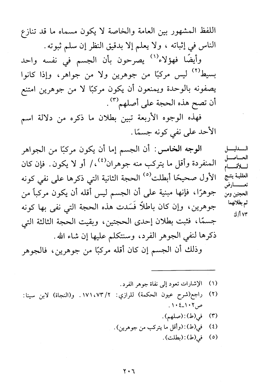 اللفظ المشهور بين العامة والخاصة لا يكون مسماه ما قد تنازع الناس في إثباته ولا يعلم إلا بدقيق النظر إن سلم ثبوته وأيضًا فهؤلاء يصرحون بأن الجسم في نفسه واحد بسيط ليس مركبًا من جوهرين ولا من جواهر وإذا كانوا يصفونه بالوحدة ويمنعون أن يكون مركبًا لا من جوهرين امتنع أن تصح هذه الحجة على أصلهم فهذه الوجوه الأربعة تبين بطلان ما ذكره من دلالة اسم الأحد على نفي كونه جسمًا الوجه الخامس أن الجسم إما أن يكون مركبًا من الجواهر المنفردة وأقل ما يتركب منه جوهران أو لا يكون فإن كان الأول صحيحًا أبطلت الحجة الثانية التي ذكرها على نفي كونه جوهرًا فإنها مبنية على أن الجسم ليس أقله أن يكون مركبًا من جوهرين وإن كان باطلاً فَسَدت هذه الحجة التي نفى بها كونه جسمًا فثبت بطلان إحدى الحجتين وبقيت الحجة الثالثة التي ذكرها لنفي الجوهر الفرد وسنتكلم عليها إن شاء الله وذلك أن الجسم إن كان أقله مركبًا من جوهرين فالجوهر