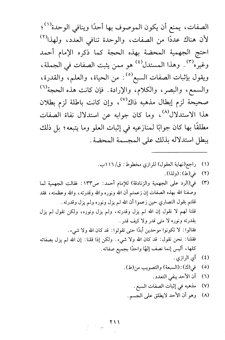 الصفات يمنع أن يكون الموصوف بها أحدًا وينافي الوحدة لأن هناك عددًا من الصفات والوحدة تنافي العدد ولهذا احتج الجهمية المحضة بهذه الحجة كما ذكره الإمام أحمد وغيره وهذا المستدل هو ممن يثبت الصفات في الجملة ويقول بإثبات الصفات السبع من الحياة والعلم والقدرة والسمع والبصر والكلام والإرادة فإن كانت هذه الحجة صحيحة لزم إبطال مذهبه ذاك وإن كانت باطلة لزم بطلان هذا الاستدلال وما كان جوابه عن استدلال نفاة الصفات مطلقًا بها كان جوابًا لمنازعيه في إثبات العلو وما يتبعه بل ذلك يبطل استدلاله بذلك على المجسمة المحضة