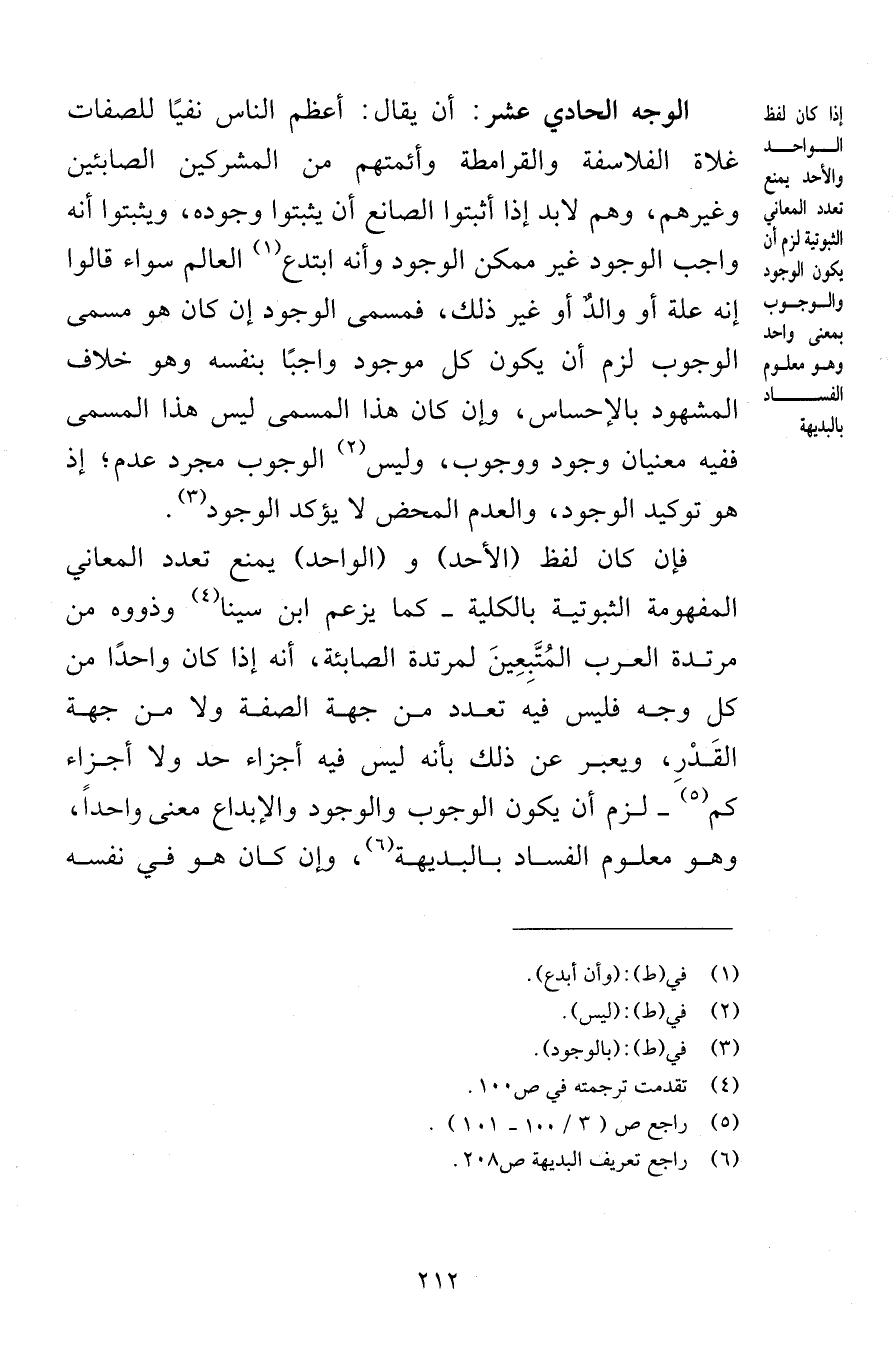 الوجه الحادي عشر أن يقال أعظم الناس نفيًا للصفات غلاة الفلاسفة والقرامطة وأئمتهم من المشركين الصابئين وغيرهم وهم لابد إذا أثبتوا الصانع أن يثبتوا وجوده ويثبتوا أنه واجب الوجود غير ممكن الوجود وأنه ابتدع العالم سواء قالوا إنه علة أو والدٌ أو غير ذلك فمسمى الوجود إن كان هو مسمى الوجوب لزم أن يكون كل موجود واجبًا بنفسه وهو خلاف المشهود بالإحساس وإن كان هذا المسمى ليس هذا المسمى ففيه معنيان وجود ووجوب وليس الوجوب مجرد عدم إذ هو توكيد الوجود والعدم المحض لا يؤكد الوجود فإن كان لفظ الأحد والواحد يمنع تعدد المعاني المفهومة الثبوتية بالكلية كما يزعم ابن سينا وذووه من مرتدة العرب المُتَّبِعِينَ لمرتدة الصابئة أنه إذا كان واحدًا من كل وجه فليس فيه تعدد من جهة الصفة ولا من جهة القَدْرِ ويعبر عن ذلك بأنه ليس فيه أجزاء حد ولا أجزاء كم لزم أن يكون الوجوب والوجود والإبداع معنى واحدًا وهو معلوم الفساد بالبديهة وإن كان هو في نفسه