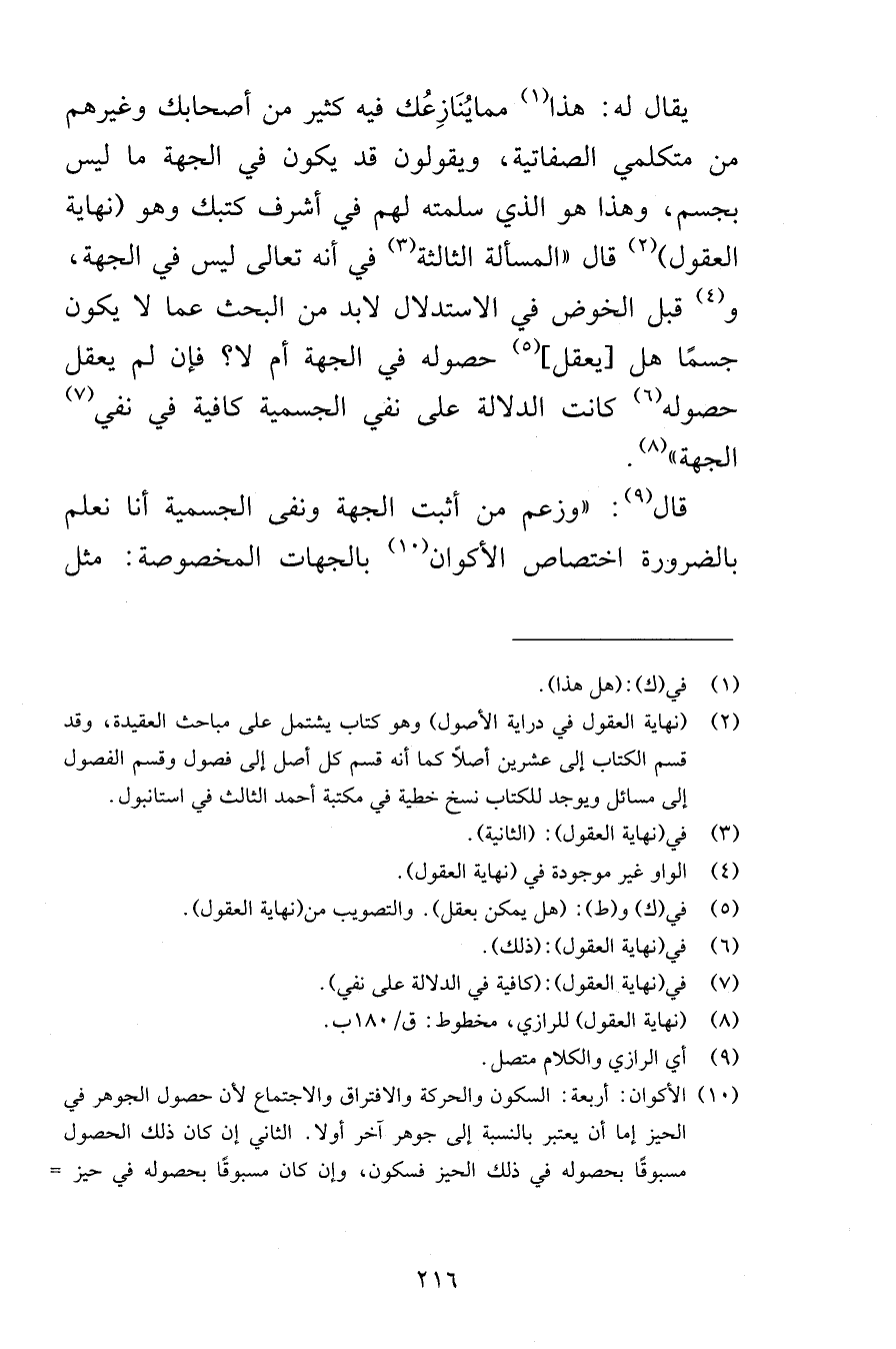 يقال له هذا مما يُنَازِعُك فيه كثير من أصحابك وغيرهم من متكلمي الصفاتية ويقولون قد يكون في الجهة ما ليس بجسم وهذا هو الذي سلمته لهم في أشرف كتبك وهو نهاية العقول قال المسألة الثالثة في أنه تعالى ليس في الجهة وقبل الخوض في الاستدلال لابد من البحث عما لا يكون جسمًا هل يعقل حصوله في الجهة أم لا فإن لم يعقل حصوله كانت الدلالة على نفي الجسمية كافية في نفي الجهة قال وزعم من أثبت الجهة ونفي الجسمية أنا نعلم بالضرورة اختصاص الأكوان بالجهات المخصوصة مثل