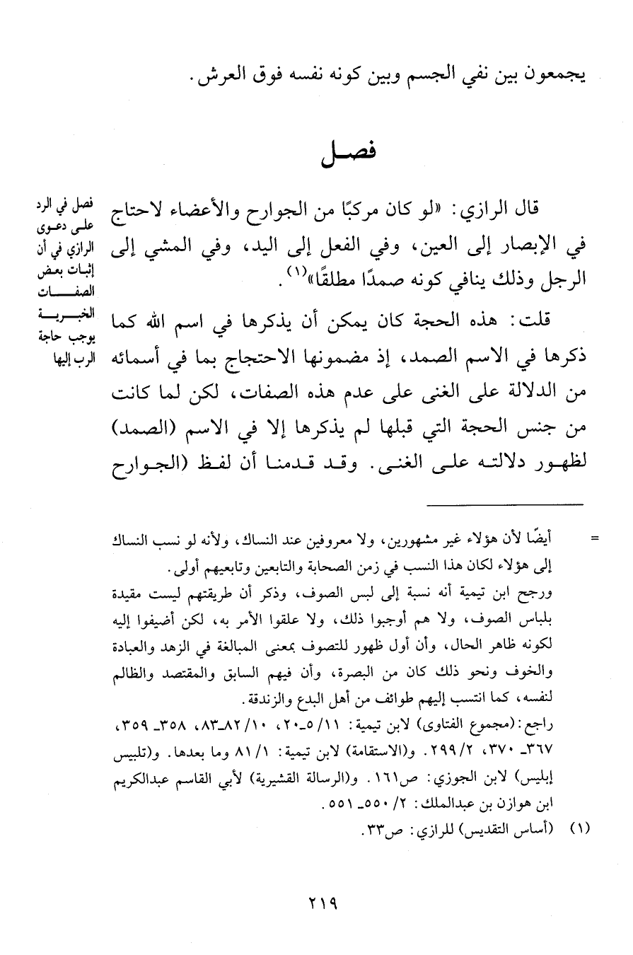 يجمعون بين نفي الجسم وبين كونه نفسه فوق العرش فصل قال الرازي لو كان مركبًا من الجوارح والأعضاء لاحتاج في الإبصار إلى العين وفي الفعل إلى اليد وفي المشي إلى الرجل وذلك ينافي كونه صمدًا مطلقًا قلت هذه الحجة كان يمكن أن يذكرها في اسم الله كما ذكرها في الاسم الصمد إذ مضمونها الاحتجاج بما في أسمائه من الدلالة على الغنى على عدم هذه الصفات لكن لما كانت من جنس الحجة التي قبلها لم يذكرها إلا في الاسم الصمد لظهور دلالته على الغنى وقد قدمنا أن لفظ الجوارح