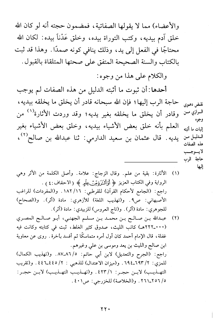 والأعضاء مما لا يقولها الصفاتية فمضمون حجته أنه لو كان الله خلق آدم بيديه وكتب التوراة بيديه وخلق عَدْناً بيديه لكان الله محتاجًا في الفعل إلى يد وذلك ينافي كونه صمدًا وهذا قد ثبت بالكتاب والسنة الصحيحة المتفق على صحتها المتلقاة بالقبول والكلام على هذا من وجوه أحدها أن ثبوت ما أثبته الدليل من هذه الصفات لم يوجب حاجة الرب إليها فإن الله سبحانه قادر أن يخلق ما يخلقه بيديه وقادر أن يخلق ما يخلقه بغير يديه وقد وردت الأثارة من العلم بأنه خلق بعض الأشياء بيديه وخلق بعض الأشياء بغير يديه قال عثمان بن سعيد الدارمي ثنا عبد الله بن صالح