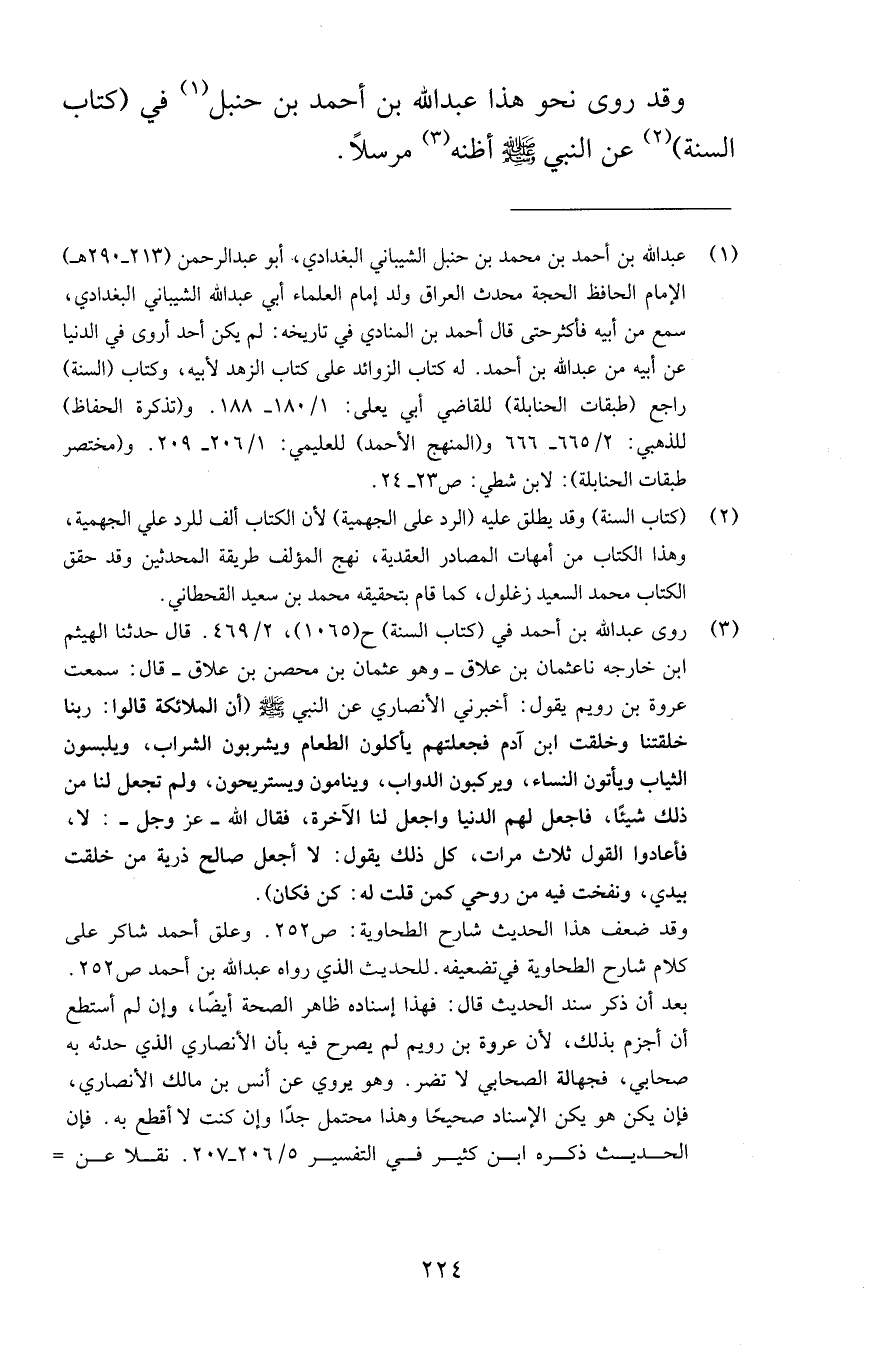 وقد روى نحو هذا عبد الله بن أحمد بن حنبل في كتاب السنة عن النبي صلى الله عليه وسلم أظنه مرسلاً