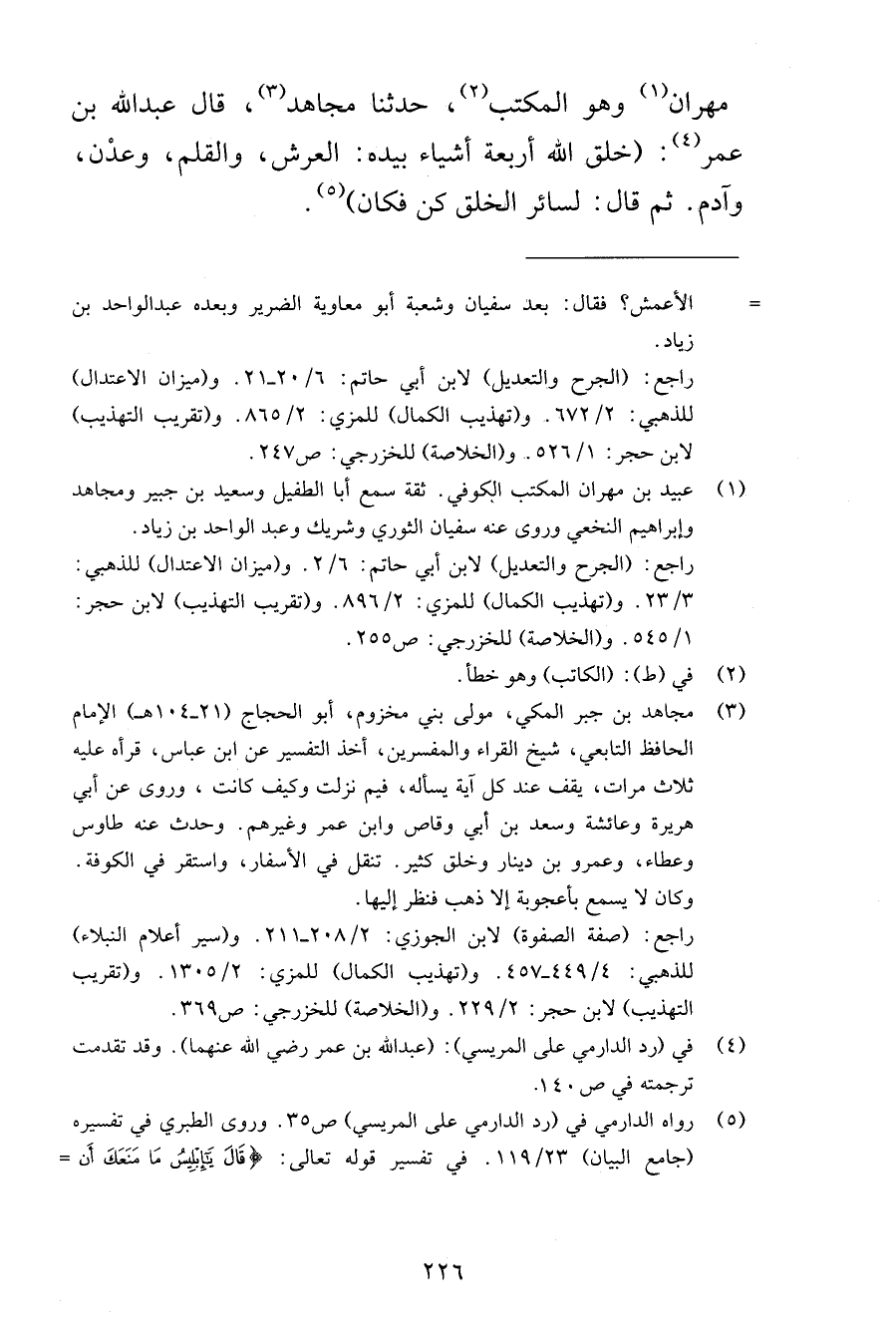مهران وهو المكتب حدثنا مجاهد قال عبد الله بن عمر خلق الله أربعة أشياء بيده العرش والقلم وعدْن وآدم ثم قال لسائر الخلق كن فكان