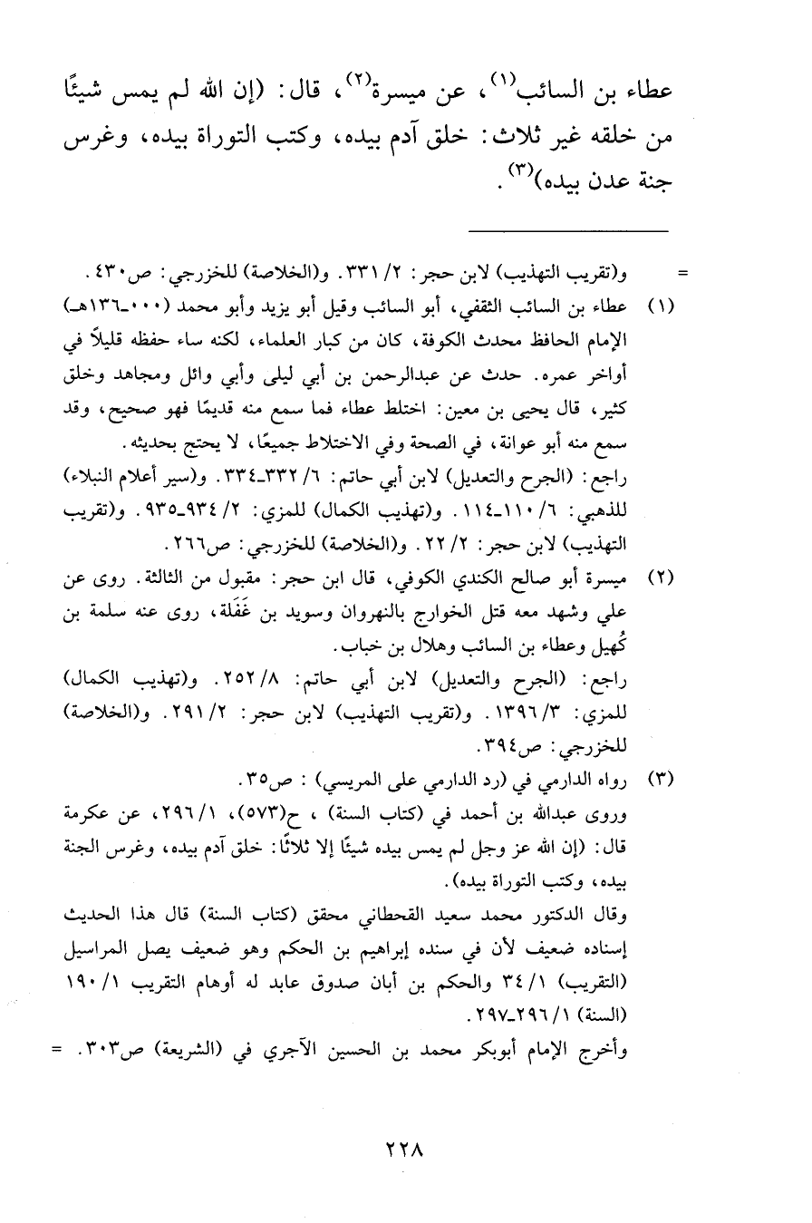 عطاء بن السائب عن ميسرة قال إن الله لم يمس شيئًا من خلقه غير ثلاث خلق آدم بيده وكتب التوراة بيده وغرس جنة عدن بيده