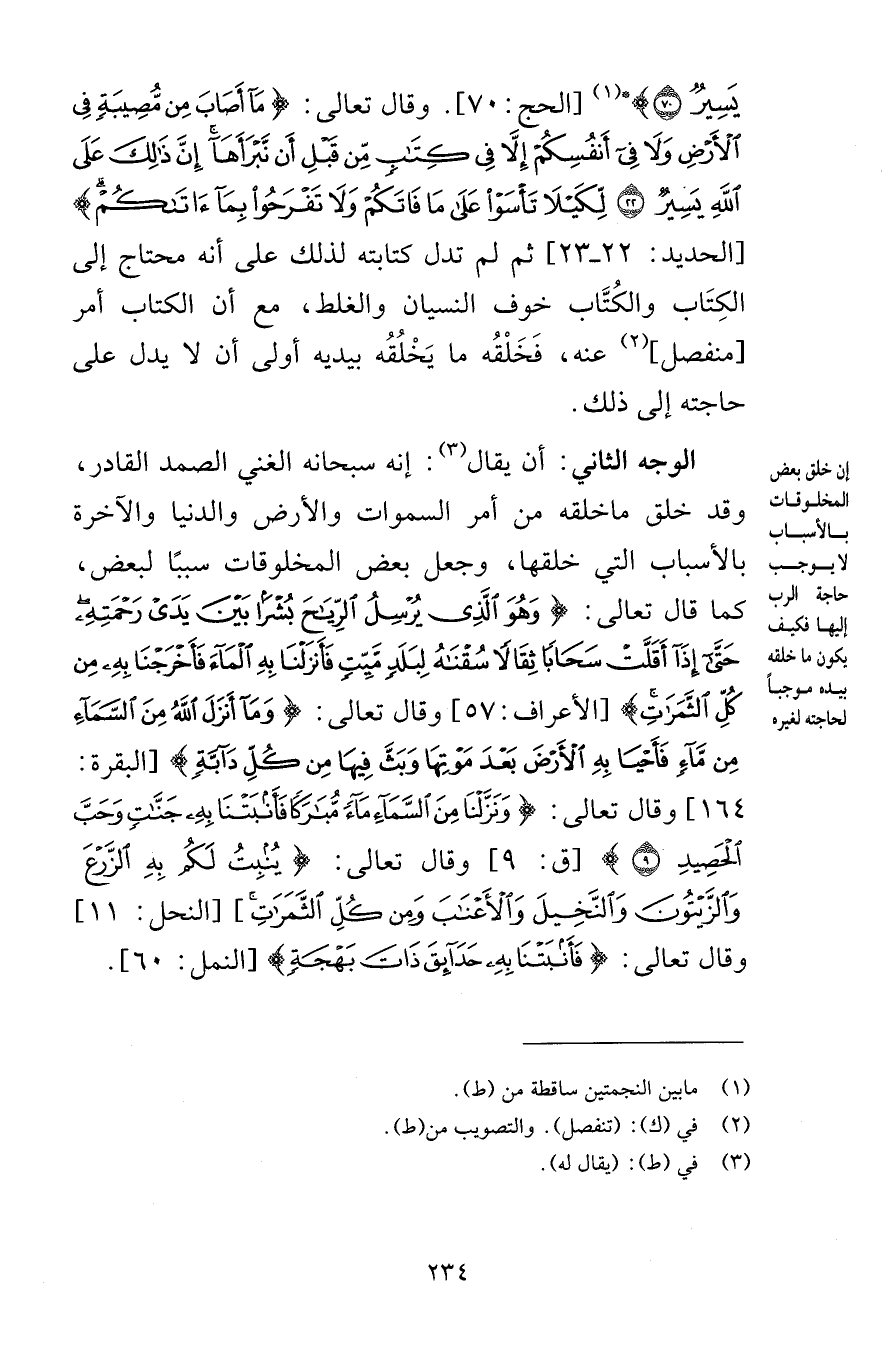 يَسِيرٌ {70} [الحج 70] وقال تعالى مَا أَصَابَ مِن مُّصِيبَةٍ فِي الْأَرْضِ وَلَا فِي أَنفُسِكُمْ إِلَّا فِي كِتَابٍ مِّن قَبْلِ أَن نَّبْرَأَهَا إِنَّ ذَلِكَ عَلَى اللَّهِ يَسِيرٌ {22} لِكَيْلَا تَأْسَوْا عَلَى مَا فَاتَكُمْ وَلَا تَفْرَحُوا بِمَا آتَاكُمْ [الحديد 22-23] ثم لم تدل كتابته لذلك على أنه محتاج إلى الكِتَاب والكُتَّاب خوف النسيان والغلط مع أن الكتاب أمر منفصل عنه فَخَلْقُه ما يَخْلُقُه بيديه أولى أن لا يدل على حاجته إلى ذلك الوجه الثاني أن يقال إنه سبحانه الغني الصمد القادر وقد خلق ماخلقه من أمر السموات والأرض والدنيا والآخرة بالأسباب التي خلقها وجعل بعض المخلوقات سببًا لبعض كما قال تعالى وَهُوَ الَّذِي يُرْسِلُ الرِّيَاحَ بُشْراً بَيْنَ يَدَيْ رَحْمَتِهِ حَتَّى إِذَا أَقَلَّتْ سَحَاباً ثِقَالاً سُقْنَاهُ لِبَلَدٍ مَّيِّتٍ فَأَنزَلْنَا بِهِ الْمَاء فَأَخْرَجْنَا بِهِ مِن كُلِّ الثَّمَرَاتِ [الأعراف 57] وقال تعالى وَمَا أَنزَلَ اللهُ مِنَ السَّمَاءِ مِن مَّاء فَأَحْيَا بِهِ الأرْضَ بَعْدَ مَوْتِهَا وَبَثَّ فِيهَا مِن كُلِّ دَآبَّةٍ [البقرة 164] وقال تعالى وَنَزَّلْنَا مِنَ السَّمَاءِ مَاءً مُّبَارَكاً فَأَنبَتْنَا بِهِ جَنَّاتٍ وَحَبَّ الْحَصِيدِ {9} [ق 9] وقال تعالى يُنبِتُ لَكُم بِهِ الزَّرْعَ وَالزَّيْتُونَ وَالنَّخِيلَ وَالأَعْنَابَ وَمِن كُلِّ الثَّمَرَاتِ [النحل 11] وقال تعالى فَأَنبَتْنَا بِهِ حَدَائِقَ ذَاتَ بَهْجَةٍ [النمل 60]