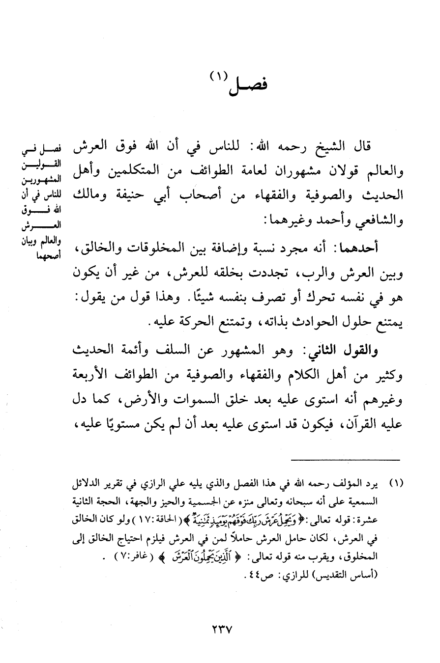 فصل قال الشيخ رحمه الله للناس في أن الله فوق العرش والعالم قولان مشهوران لعامة الطوائف من المتكلمين وأهل الحديث والصوفية والفقهاء من أصحاب أبي حنيفة ومالك والشافعي وأحمد وغيرهما أحدهما أنه مجرد نسبة وإضافة بين المخلوقات والخالق وبين العرش والرب تجددت بخلقه للعرش من غير أن يكون هو في نفسه تحرك أو تصرف بنفسه شيئًا وهذا قول من يقول يمتنع حلول الحوادث بذاته وتمتنع الحركة عليه والقول الثاني وهو المشهور عن السلف وأئمة الحديث وكثير من أهل الكلام والفقهاء والصوفية من الطوائف الأربعة وغيرهم أنه استوى عليه بعد خلق السموات والأرض كما دل عليه القرآن فيكون قد استوى عليه بعد أن لم يكن مستويًا عليه