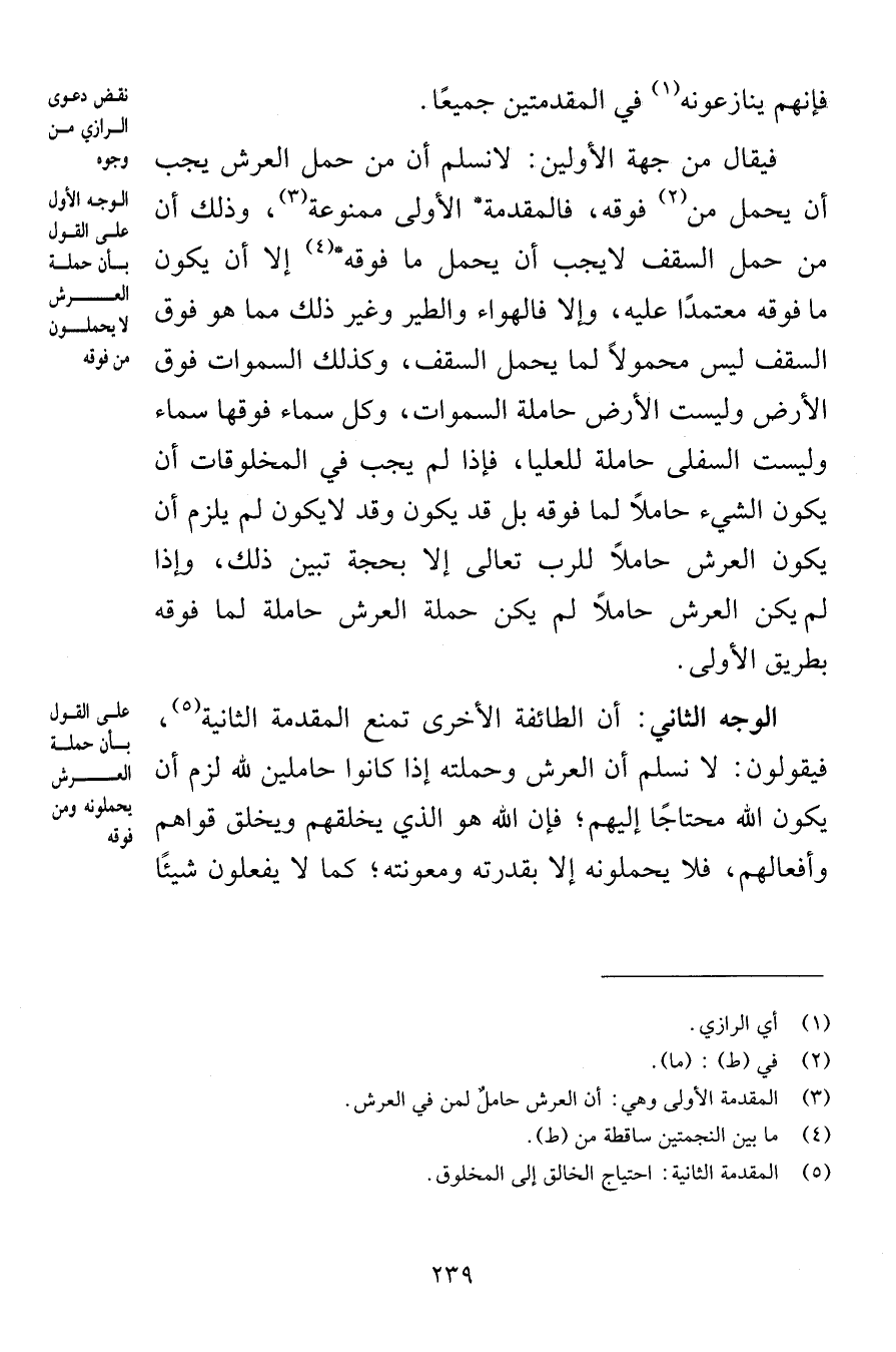 فإنهم ينازعونه في المقدمتين جميعًا فيقال من جهة الأولين لانسلم أن من حمل العرش يجب أن يحمل من فوقه فالمقدمة الأولى ممنوعة وذلك أن من حمل السقف لايجب أن يحمل ما فوقه إلا أن يكون ما فوقه معتمدًا عليه وإلا فالهواء والطير وغير ذلك مما هو فوق السقف ليس محمولاً لما يحمل السقف وكذلك السموات فوق الأرض وليست الأرض حاملة السموات وكل سماء فوقها سماء وليست السفلى حاملة للعليا فإذا لم يجب في المخلوقات أن يكون الشيء حاملاً لما فوقه بل قد يكون وقد لا يكون لم يلزم أن يكون العرش حاملاً للرب تعالى إلا بحجة تبين ذلك وإذا لم يكن العرش حاملاً لم يكن حملة العرش حاملة لما فوقه بطريق الأولى الوجه الثاني أن الطائفة الأخرى تمنع المقدمة الثانية فيقولون لا نسلم أن العرش وحملته إذا كانوا حاملين لله لزم أن يكون الله محتاجًا إليهم فإن الله هو الذي يخلقهم ويخلق قواهم وأفعالهم فلا يحملونه إلا بقدرته ومعونته كما لا يفعلون شيئًا