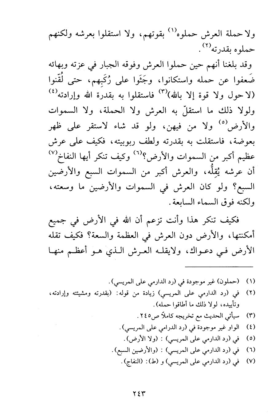 ولا حملة العرش حملوه بقوتهم ولا استقلوا بعرشه ولكنهم حملوه بقدرته وقد بلغنا أنهم حين حملوا العرش وفوقه الجبار في عزته وبهائه ضَعفوا عن حمله واستكانوا وجَثَوا على رُكَبِهم حتى لُقّنوا لا حول ولا قوة إلا بالله فاستقلوا به بقدرة الله وإرادته ولولا ذلك ما استقلّ به العرش ولا الحملة ولا السموات والأرض ولا من فيهن ولو قد شاء لاستقر على ظهر بعوضة فاستقلت به بقدرته ولطف ربوبيته فكيف على عرش عظيم أكبر من السموات والأرض وكيف تنكر أيها النفاخ أن عرشه يُقِلُّه والعرش أكبر من السموات السبع والأرضين السبع ولو كان العرش في السموات والأرضين ما وسعته ولكنه فوق السماء السابعة فكيف تنكر هذا وأنت تزعم أن الله في الأرض في جميع أمكنتها والأرض دون العرش في العظمة والسعة فكيف تقله الأرض في دعواك ولايقله العرش الذي هو أعظم منها