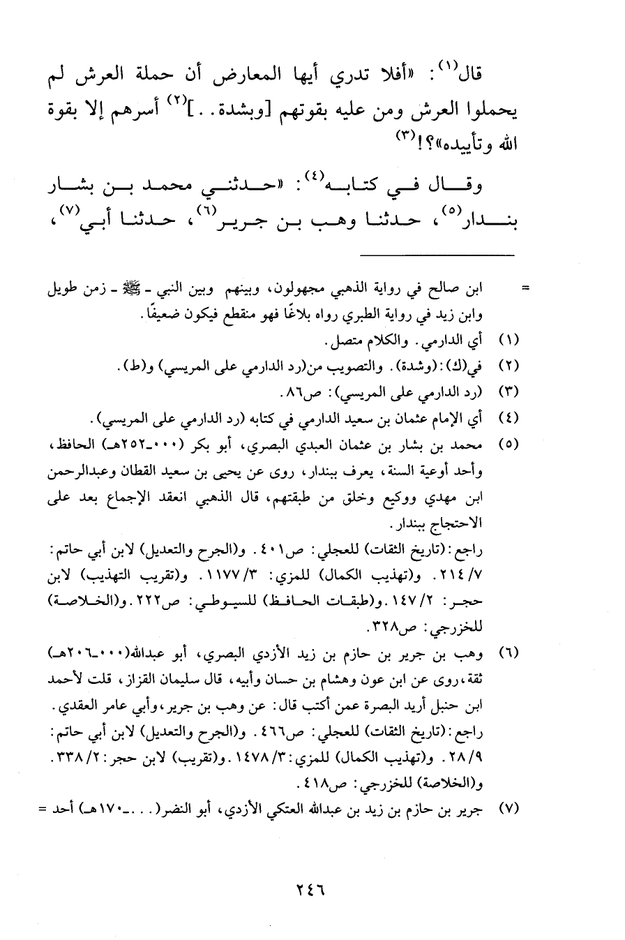 قال أفلا تدري أيها المعارض أن حملة العرش لم يحملوا العرش ومن عليه بقوتهم وبشدة أسرهم إلا بقوة الله وتأييده وقال في كتابه حدثني محمد بن بشار بندار حدثنا وهب بن جرير حدثنا أبي