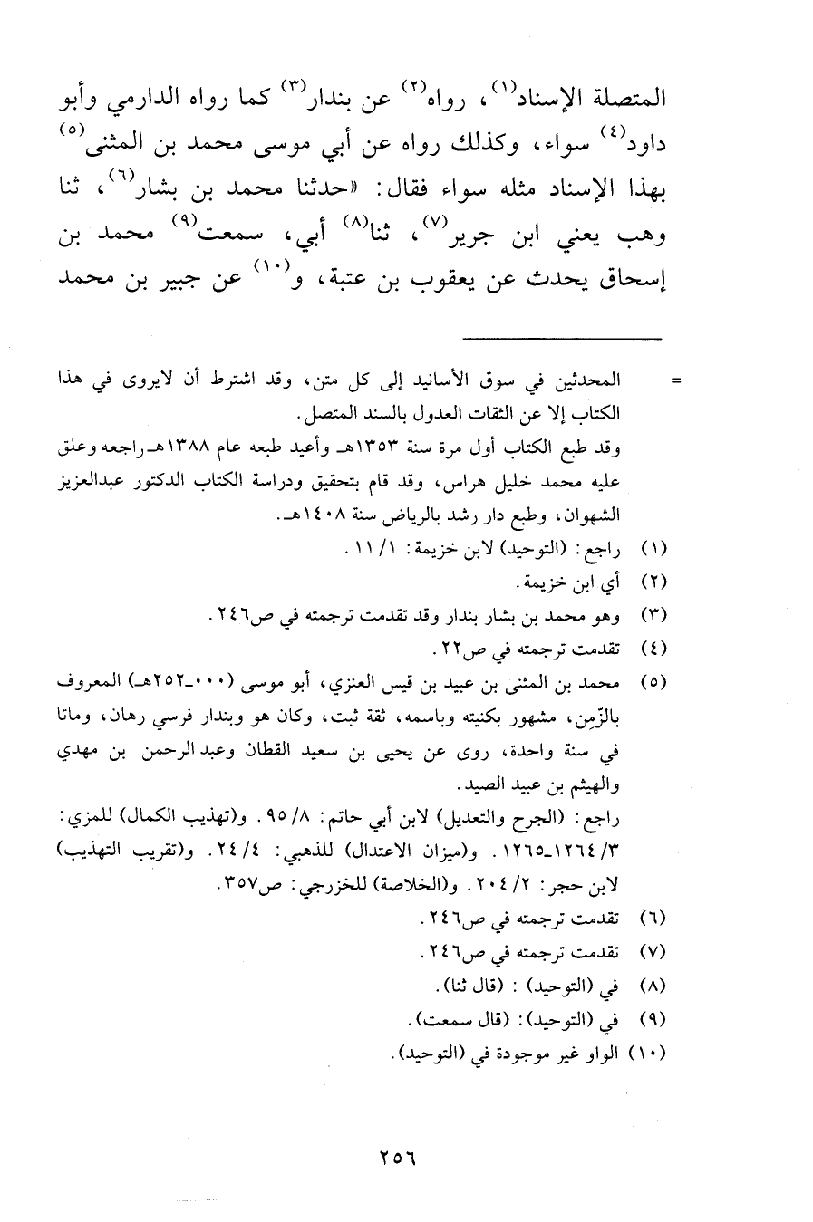 المتصلة الإسناد رواه عن بندار كما رواه الدارمي وأبو داود سواء وكذلك رواه عن أبي موسى محمد بن المثنى بهذا الإسناد مثله سواء فقال حدثنا محمد بن بشار ثنا وهب يعني ابن جرير ثنا أبي سمعت محمد بن إسحاق يحدث عن يعقوب بن عتبة وعن جبير بن محمد
