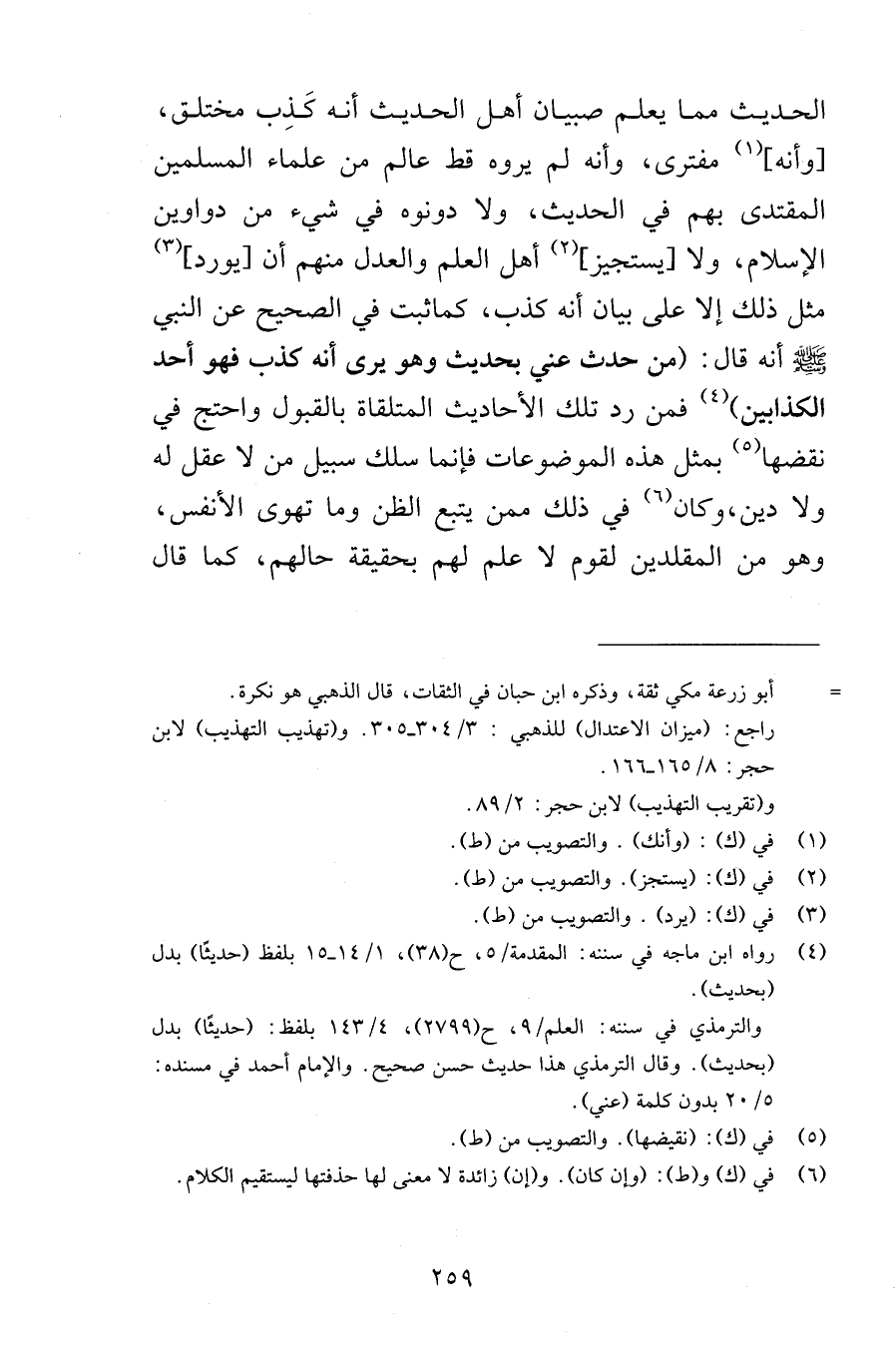 الحديث مما يعلم صبيان أهل الحديث أنه كَذِب مختلق وأنه مفترى وأنه لم يروه قط عالم من علماء المسلمين المقتدى بهم في الحديث ولا دونوه في شيء من دواوين الإسلام ولا يستجيز أهل العلم والعدل منهم أن يورد مثل ذلك إلا على بيان أنه كذب كماثبت في الصحيح عن النبي صلى الله عليه وسلم أنه قال من حدث عني بحديث وهو يرى أنه كذب فهو أحد الكذابين فمن رد تلك الأحاديث المتلقاة بالقبول واحتج في نقضها بمثل هذه الموضوعات فإنما سلك سبيل من لا عقل له ولا دين وكان في ذلك ممن يتبع الظن وما تهوى النفس وهو من المقلدين لقوم لا علم لهم بحقيقة حالهم كما قال