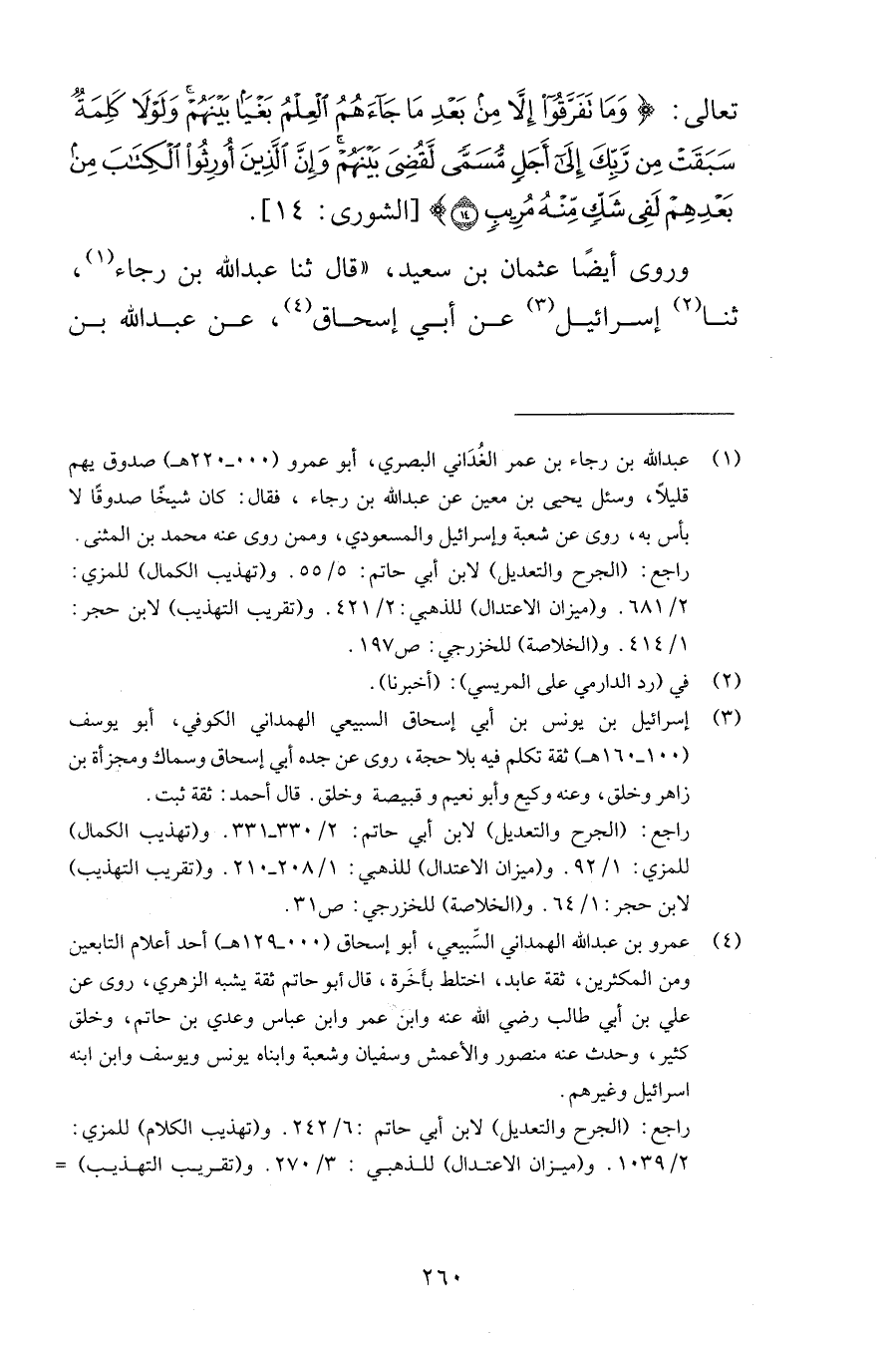 تعالى وَمَا تَفَرَّقُوا إِلَّا مِن بَعْدِ مَا جَاءهُمُ الْعِلْمُ بَغْياً بَيْنَهُمْ وَلَوْلَا كَلِمَةٌ سَبَقَتْ مِن رَّبِّكَ إِلَى أَجَلٍ مُّسَمًّى لَّقُضِيَ بَيْنَهُمْ وَإِنَّ الَّذِينَ أُورِثُوا الْكِتَابَ مِن بَعْدِهِمْ لَفِي شَكٍّ مِّنْهُ مُرِيبٍ {14} [الشورى 14] وروى أيضًا عثمان بن سعيد قال ثنا عبد الله بن رجاء ثنا إسرائيل عن أبي إسحاق عن عبد الله بن