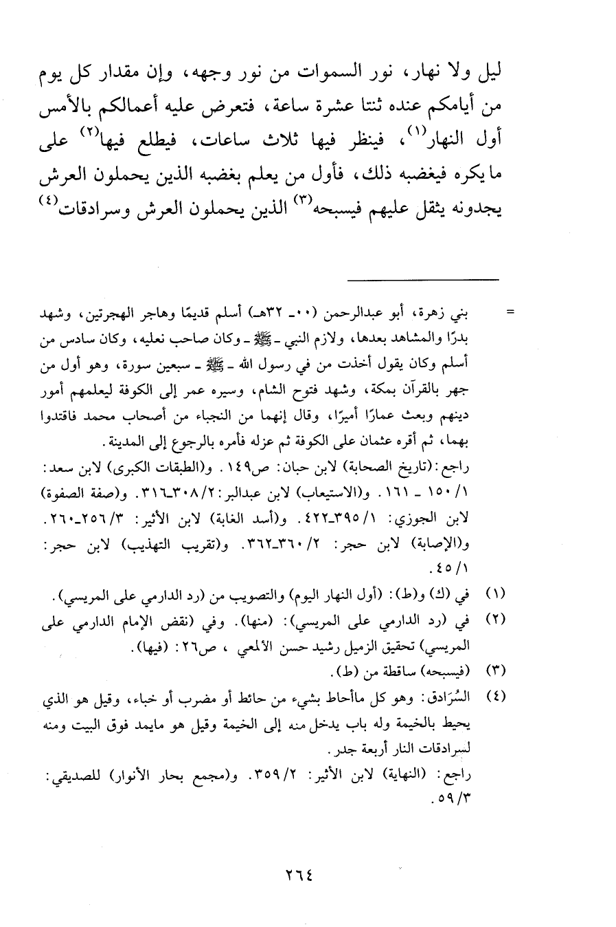 ليل ولا نهار نور السموات من نور وجهه وإن مقدار كل يوم من أيامكم عنده ثنتا عشرة ساعة فتعرض عليه أعمالكم بالمس أول النهار فينظر فيها ثلاث ساعات فيطلع فيها على ما يكره فيغضبه ذلك فأول من يعلم بغضبه الذين يحملون العرش يجدونه يثقل عليهم فيسبحه الذين يحملون العرش وسرادقات