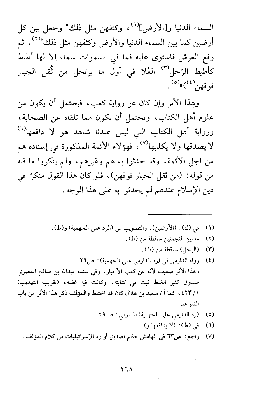 السماء الدنيا والأرض وكثفهن مثل ذلك وجعل بين كل أرضين كما بين السماء الدنيا والأرض وكثفهن مثل ذلك ثم رفع العرش فاستوى عليه فما في السموات سماء إلا لها أطيط كأطيط الرّحل العُلا في أول ما يرتحل من ثُقل الجبار فوقهن وهذا الأثر وإن كان في رواية كعب فيحتمل أن يكون من علوم أهل الكتاب ويحتمل أن يكون مما تلقاه عن الصحابة ورواية أهل الكتاب التي ليس عندنا شاهد هو لا دافعها لا يصدقها ولا يكذبها فهؤلاء الأئمة المذكورة في إسناده هم من أجل الأئمة وقد حدثوا به هم وغيرهم ولم ينكروا ما فيه من قوله من ثقل الجبار فوقهن فلو كان هذا القول منكرًا في دين الإسلام عندهم لم يحدثوا به على هذا الوجه