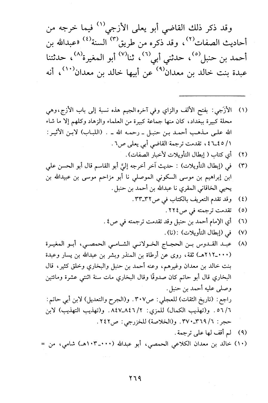 وقد ذكر ذلك القاضي أبو يعلى الأزجي فيما خرجه من أحاديث الصفات وقد ذكره عن طريق السنة عبد الله بن أحمد بن حنبل حدثني أبي ثنا أبو المغيرة حدثتنا عبدة بنت خالد بن معدان عن أبيها خالد بن معدان أنه