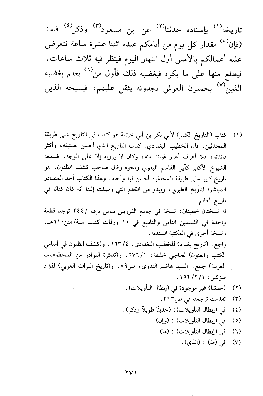 تاريخه بإسناده حدثنا عن ابن مسعود وذكر فيه فإن مقدار كل يوم من أيامكم عنده اثنتا عشرة ساعة فتعرض عليه أعمالكم بالأمس أول النهار اليوم فينظر فيه ثلاث ساعات فيطلع منها على ما يكره فيغضبه ذلك فأول من يعلم بغضبه الذين يحملون العرش يجدونه يثقل عليهم فيسبحه الذين