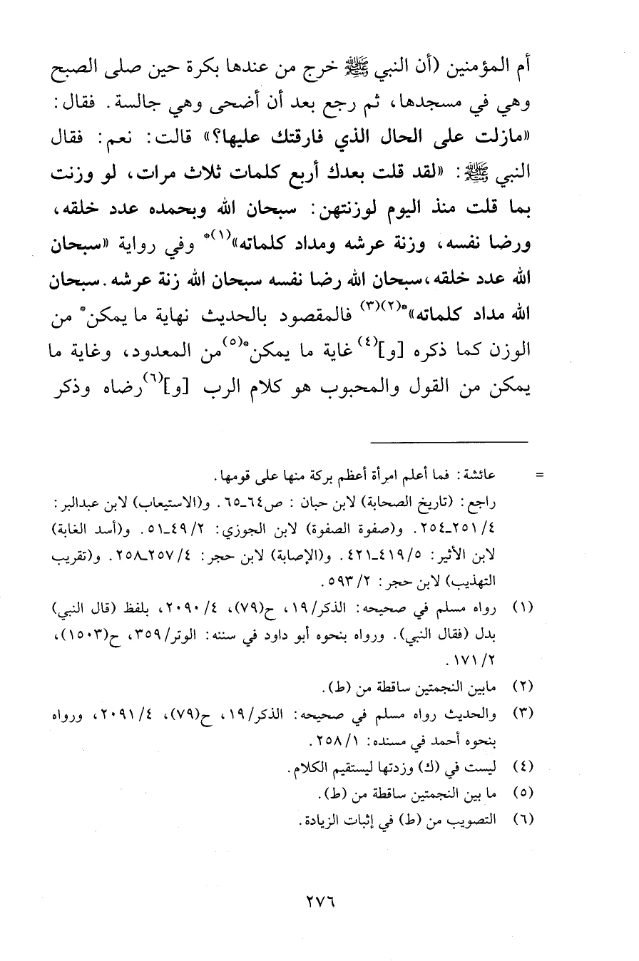 أم المؤمنين أن النبي صلى الله عليه وسلم خرج من عندها بكرة حين صلى الصبح وهي في مسجدها ثم رجع بعد أن أضحى وهي جالسة فقال مازلت على الحال الذي فارقتك عليها قالت نعم فقال النبي صلى الله عليه وسلم لقد قلت بعدك أربع كلمات ثلاث مرات لو وزنت بما قلت منذ اليوم لوزنتهن سبحان الله وبحمده عدد خلقه ورضا نفسه وزنة عرشه ومداد كلماته وفي رواية سبحان الله عدد خلقه سبحان الله رضا نفسه سبحان الله زنة عرشه سبحان الله مداد كلماته فالمقصود بالحديث نهاية ما يمكن من الوزن كما ذكره وغاية ما يمكن من المعدود وغاية ما يمكن من القول والمحبوب هو كلام الرب ورضاه وذكر
