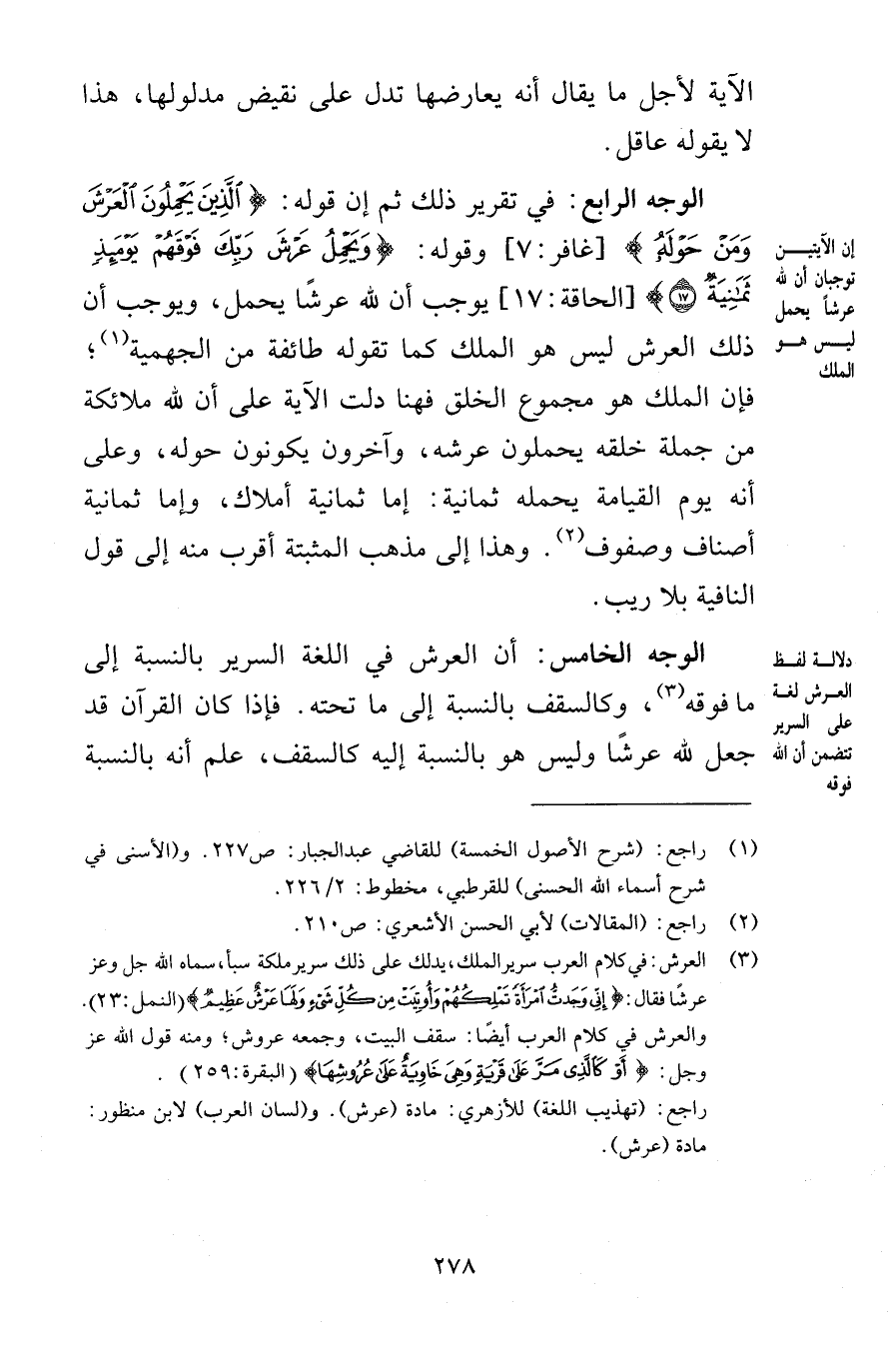 الآية لأجل ما يقال أنه يعارضها تدل على نقيض مدلولها هذا لا يقوله عاقل الوجه الرابع في تقرير ذلك ثم إن قوله الَّذِينَ يَحْمِلُونَ الْعَرْشَ وَمَنْ حَوْلَهُ [غافر 7] وقوله وَيَحْمِلُ عَرْشَ رَبِّكَ فَوْقَهُمْ يَوْمَئِذٍ ثَمَانِيَةٌ {17} [الحاقة 17] يوجب أن لله عرشًا يحمل ويوجب أن ذلك العرش ليس هو الملك كما تقوله طائفة من الجهمية فإن الملك هو مجموع الخلق فهنا دلت الآية على أن لله ملائكة من جملة خلقه يحملون عرشه وآخرون يكونون حوله وعلى أنه يوم القيامة يحمله ثمانية إما ثمانية أملاك وإما ثمانية أصناف وصنوف وهذا إلى مذهب المثبتة أقرب منه إلى قول النافية بلا ريب الوجه الخامس أن العرش في اللغة السرير بالنسبة إلى ما فوقه وكالسقف بالنسبة إلى ما تحته فإذا كان القرآن قد جعل لله عرشًا وليس هو بالنسبة إليه كالسقف علم أنه بالنسبة