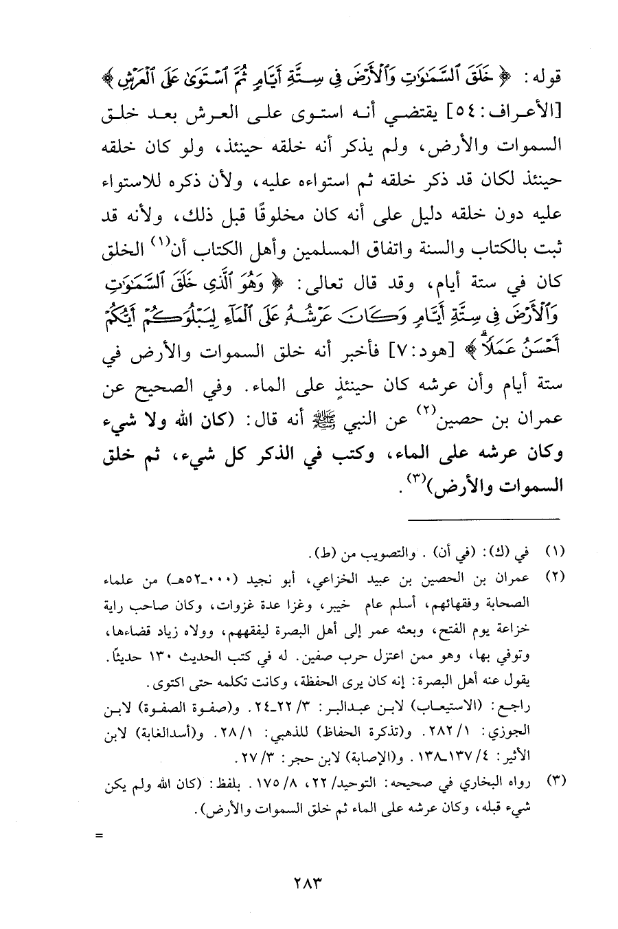قوله خَلَقَ السَّمَاوَاتِ وَالأَرْضَ فِي سِتَّةِ أَيَّامٍ ثُمَّ اسْتَوَى عَلَى الْعَرْشِ [الأعراف 54] يقتضي أنه استوى على العرش بعد خلق السموات والأرض ولم يذكر أنه خلقه حينئذ ولو كان خلقه حينئذ لكان قد ذكر خلقه ثم استواءه عليه ولأن ذكره للاستواء عليه دون خلقه دليل على أنه كان مخلوقًا قبل ذلك ولأنه قد ثبت بالكتاب والسنة واتفاق المسلمين وأهل الكتاب أن الخلق كان في ستة أيام وقد قال تعالى وَهُوَ الَّذِي خَلَق السَّمَاوَاتِ وَالأَرْضَ فِي سِتَّةِ أَيَّامٍ وَكَانَ عَرْشُهُ عَلَى الْمَاء لِيَبْلُوَكُمْ أَيُّكُمْ أَحْسَنُ عَمَلاً [هود 7] فأخبر أنه خلق السموات والأرض في ستة أيام وأن عرشه كان حينئذٍ على الماء وفي الصحيح عن عمران بن حصين عن النبي صلى الله عليه وسلم أنه قال كان الله ولا شيء وكان عرشه على الماء وكتب في الذكر كل شيء ثم خلق السموات والأرض