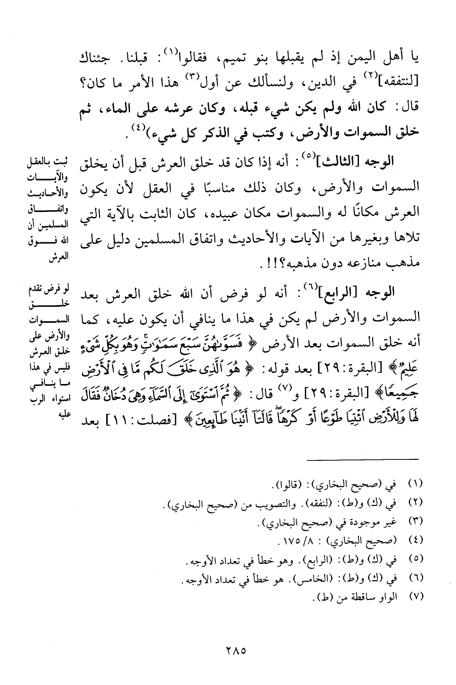 يا أهل اليمن إذ لم يقبلها بنو تميم قبلنا جئناك لنتفقه في الدين ولنسألك عن أول هذا الأمر ما كان قال كان الله ولم يكن شيء قبله وكان عرشه على الماء ثم خلق السموات والأرض وكان ذلك مناسبًا في العقل لأن يكون العرش مكانًا له والسموات مكان عبيده كان ثابت بالآية التي تلاها وبغيرها من الآيات والأحاديث واتفاق المسلمين دليل على مذهب منازعه دون مذهبه الوجه الرابع أنه لو فرض أن الله خلق العرش بعد السموات والأرض لم يكن في هذا ما ينافي أن يكون عليه كما أنه خلق السموات بعد الأرض فَسَوَّاهُنَّ سَبْعَ سَمَاوَاتٍ وَهُوَ بِكُلِّ شَيْءٍ عَلِيمٌ [البقرة 29] بعد قوله هُوَ الَّذِي خَلَقَ لَكُم مَّا فِي الأَرْضِ جَمِيعاً [البقرة 29] وقال ثُمَّ اسْتَوَى إِلَى السَّمَاء وَهِيَ دُخَانٌ فَقَالَ لَهَا وَلِلْأَرْضِ اِئْتِيَا طَوْعاً أَوْ كَرْهاً قَالَتَا أَتَيْنَا طَائِعِينَ [فصلت 11] بعد