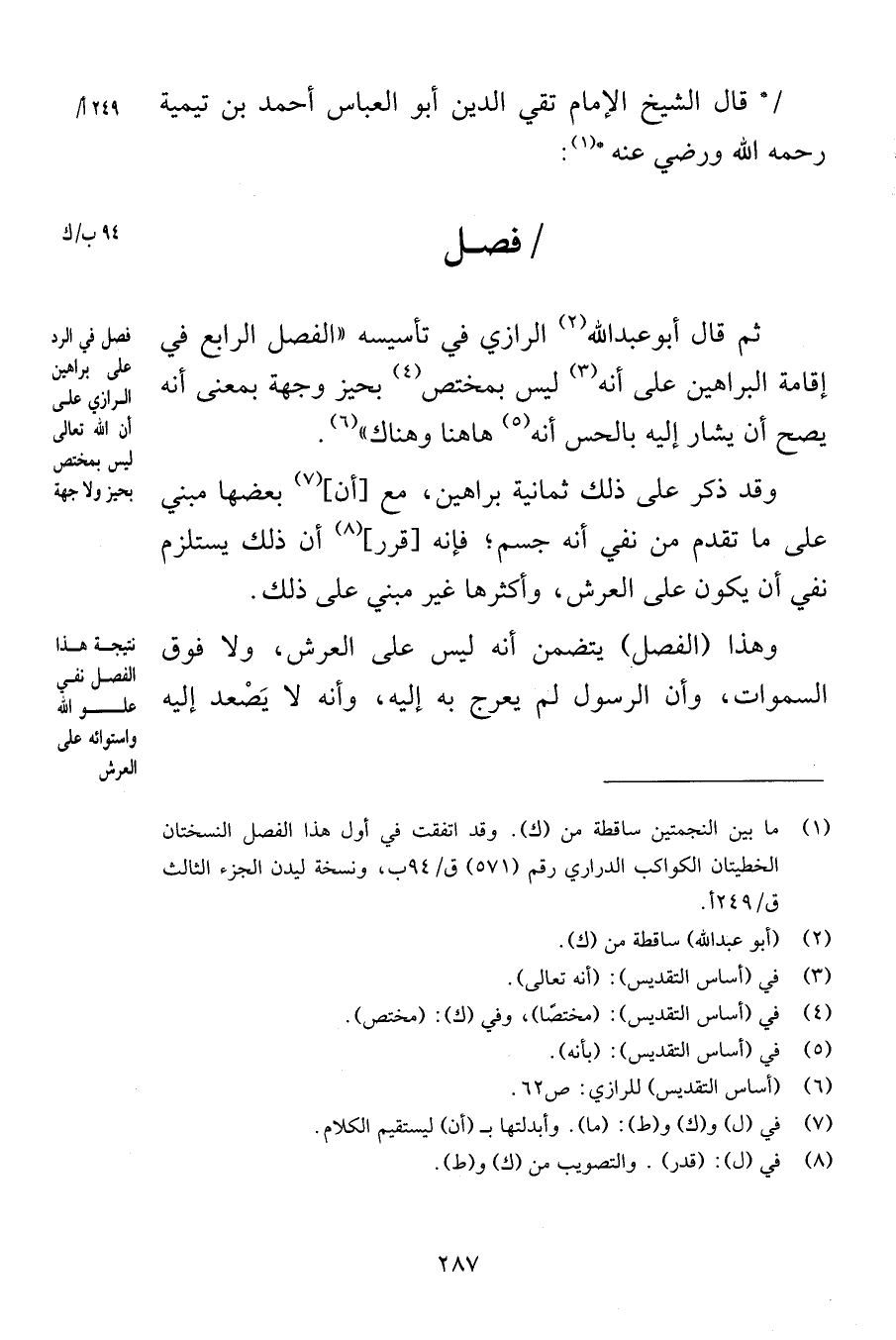 قال الشيخ الإمام تقي الدين أبو العباس أحمد ابن تيمية رحمه الله ورضي عنه فصل ثم قال أبوعبد الله الرازي في تأسيسه الفصل الرابع في إقامة البراهين على أنه ليس بمختص بحيز وجهة بمعنى أنه يصح أن يشار إليه بالحس أنه هاهنا وهناك وقد ذكر على ذلك ثمانية براهين مع أن بعضها مبني على ما تقدم من نفي أنه جسم فإنه قرر أن ذلك يستلزم نفي أن يكون على العرش وأكثرها غير مبني على ذلك وهذا الفصل يتضمن أنه ليس على العرش ولا فوق السموات وأن الرسول لم يعرج به إليه وأنه لا يَصْعد إليه