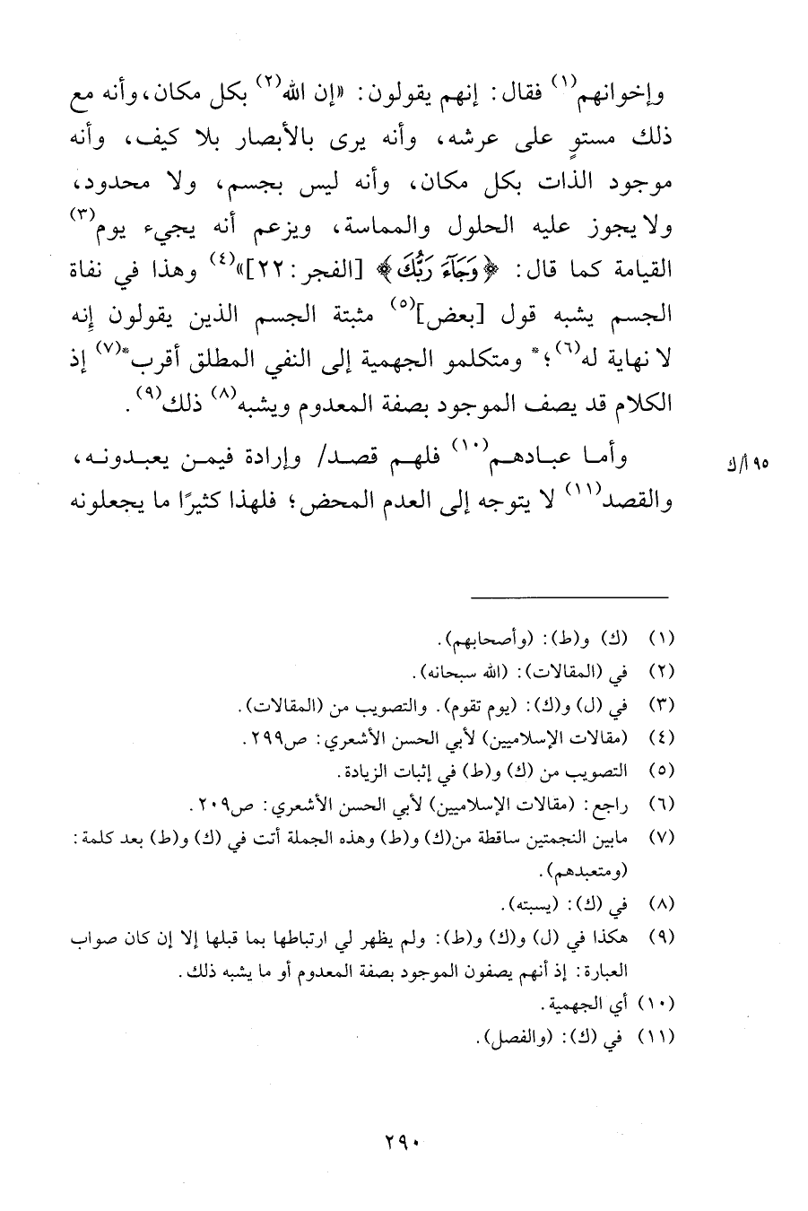 وإخوانهم فقال إنهم يقولون إن الله بكل مكان وأنه مع ذلك مستوٍ على عرشه وأنه يرى بالأبصار بلا كيف وأنه موجود الذات بكل مكان وأنه ليس بجسم ولا محدود ولا يجوز عليه الحلول والمماسة ويزعم أنه يجيء يوم القيامة كما قال وَجَاء رَبُّكَ [الفجر 22] وهذا في نفاة الجسم يشبه قول بعض مثبتة الجسم الذين يقولون إِنه لا نهاية له ومتكلمو الجهمية إلى النفي المطلق أقرب إذ الكلام قد يصف الموجود بصفة المعدوم ويشبه ذلك وأما عبادهم فلهم قصد وإرادة فيمن يعبدونه والقصد لا يتوجه إلى العدم المحض فلهذا كثيرًا ما يجعلونه