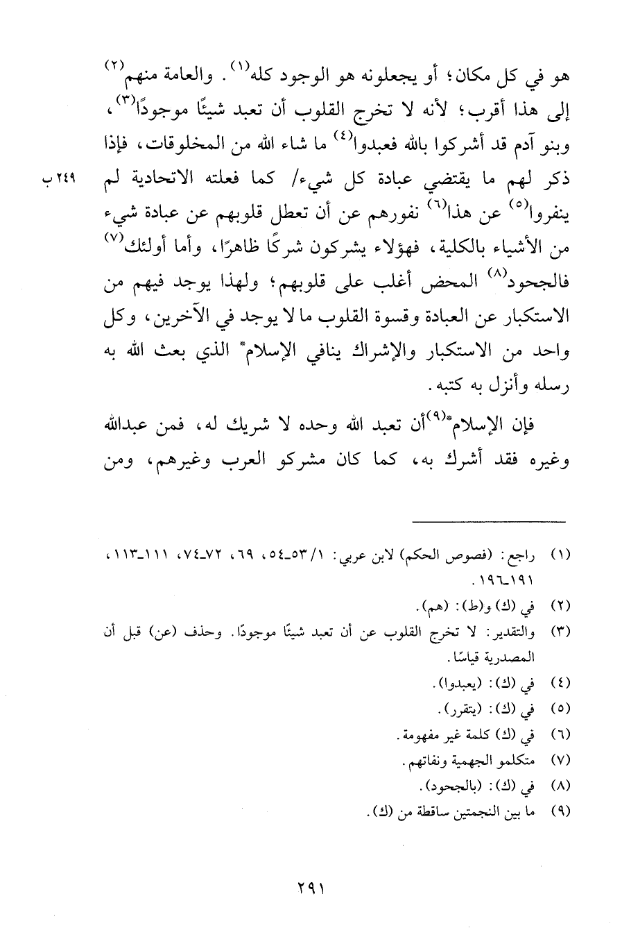 هو في كل مكان أو يجعلونه هو الوجود كله والعامة منهم إلى هذا أقرب لأنه لا تخرج القلوب أن تعبد شيئًا موجودًا وبنو آدم قد أشركوا بالله فعبدوا ما شاء الله من المخلوقات فإذا ذكر لهم ما يقتضي عبادة كل شيء كما فعلته الاتحادية لم ينفروا عن هذا نفورهم عن أن تعطل قلوبهم عن عبادة شيء من الأشياء بالكلية فهؤلاء يشركون شركًا ظاهرًا وأما أولئك فالجحود المحض أغلب على قلوبهم ولهذا يوجد فيهم من الاستكبار عن العبادة وقسوة القلوب ما لا يوجد في الآخرين وكل واحد من الاستكبار والإشراك ينافي الإسلام الذي بعث الله به رسله وأنزل به كتبه فإن الإسلام أن تعبد الله وحده لا شريك له فمن عبد الله وغيره فقد أشرك به كما كان مشركو العرب وغيرهم ومن