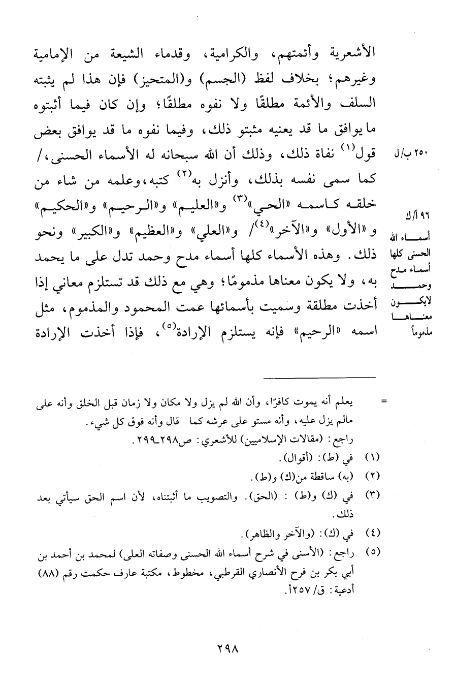 الأشعرية وأئمتهم والكرامية وقدماء الشيعة من الإمامية وغيرهم بخلاف لفظ الجسم والمتحيز فإن هذا لم يثبته السلف والأئمة مطلقًا ولا نفوه مطلقًا وإن كان فيما أثبتوه ما يوافق ما قد يعنيه مثبتو ذلك وفيما نفوه ما قد يوافق بعض قول نفاة ذلك وذلك أن الله سبحانه له الأسماء الحسنى كما سمى نفسه بذلك وأنزل به كتبه وعلمه من شاء من خلقه كاسمه الحي والعليم والرحيم والحكيم والأول والآخر والعلي والعظيم والكبير ونحو ذلك وهذه الأسماء كلها أسماء مدح وحمد تدل على ما يحمد به ولا يكون معناها مذمومًا وهي مع ذلك قد تستلزم معاني إذا أخذت مطلقة وسميت بأسمائها عمت المحمود والمذموم مثل اسمه الرحيم فإنه يستلزم الإرادة فإذا أخذت الإرادة