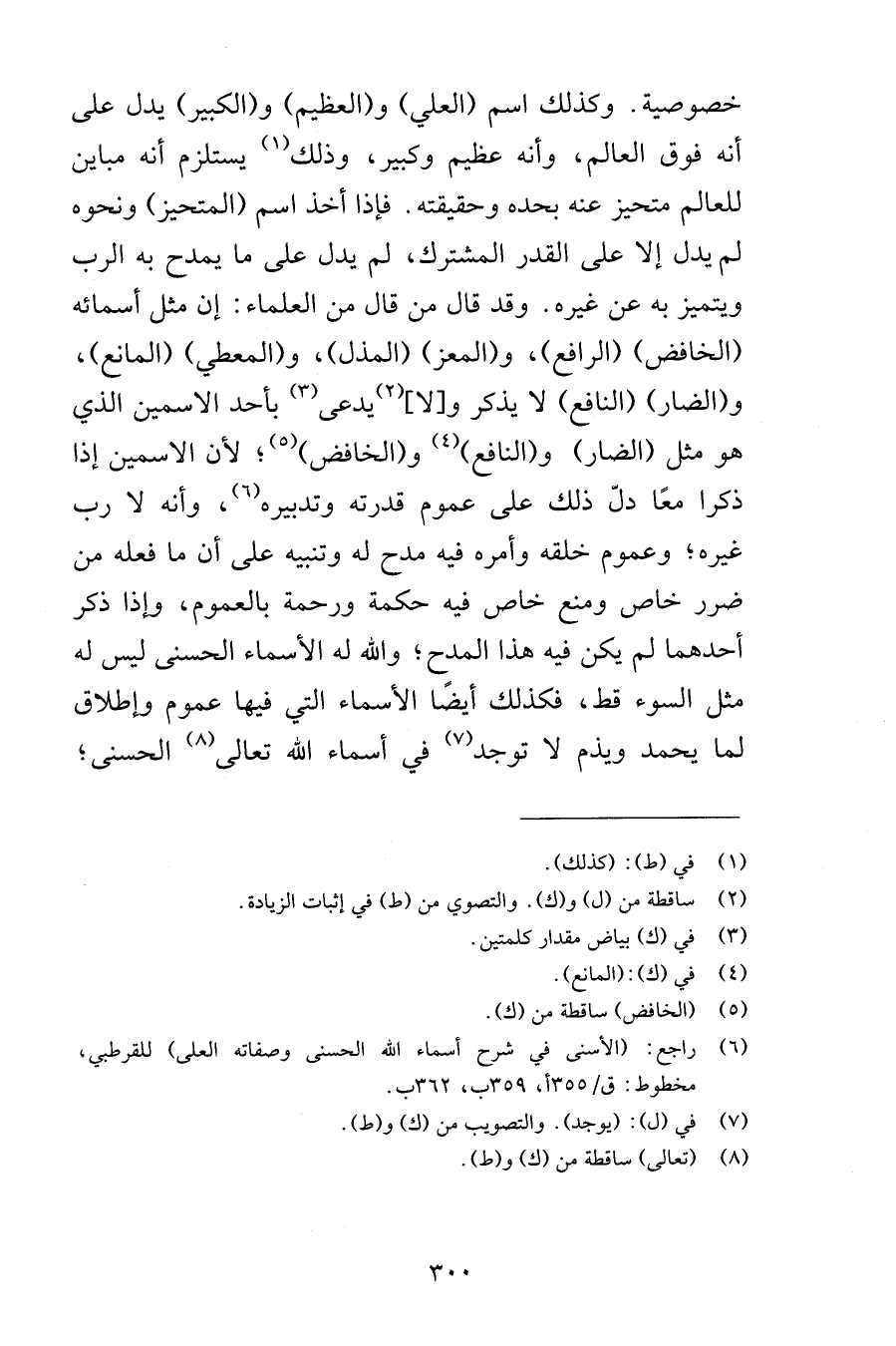خصوصية وكذلك اسم العلي والعظيم والكبير يدل على أنه فوق العالم وأنه عظيم وكبير وذلك يستلزم أنه مباين للعالم متحيز عنه بحده وحقيقته فإذا أخذ اسم المتحيز ونحوه لم يدل إلا على القدر المشترك لم يدل على ما يمدح به الرب ويتميز به عن غيره وقد قال من قال من العلماء إن مثل أسمائه الخافض الرافع والمعز المذل والمعطي المانع والضار النافع لا يذكر ولا يدعى بأحد الاسمين الذي هو مثل الضار والنافع والخافض لأن الاسمين إذا ذكرا معًا دلّ ذلك على عموم قدرته وتدبيره وأنه لا رب غيره وعموم خلقه وأمره فيه مدح له وتنبيه على أن ما فعله من ضرر خاص ومنع خاص فيه حكمة ورحمة بالعموم وإذا ذكر أحدهما لم يكن فيه هذا المدح والله له الأسماء الحسنى ليس له مثل السوء قط فكذلك أيضًا الأسماء التي فيها عموم وإطلاق لما يحمد ويذم لا توجد في أسماء الله تعالى الحسنى