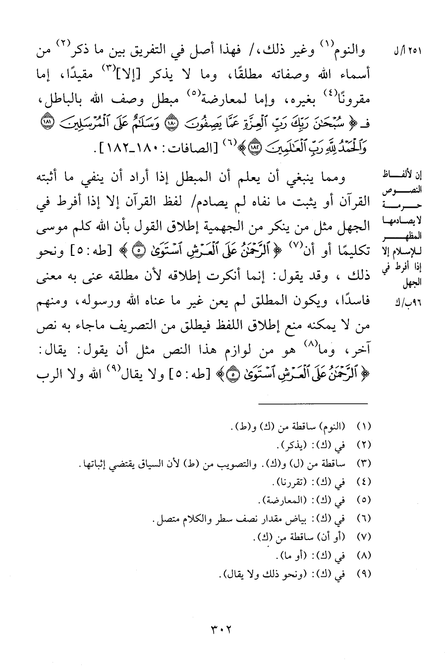 والنوم وغير ذلك فهذا أصل في التفريق بين ما ذكر من أسماء الله وصفاته مطلقًا وما لا يذكر إلا مقيدًا إما مقرونًا بغيره وإما لمعارضة مبطل وصف الله بالباطل فـ سُبْحَانَ رَبِّكَ رَبِّ الْعِزَّةِ عَمَّا يَصِفُونَ {180} وَسَلَامٌ عَلَى الْمُرْسَلِينَ {181} وَالْحَمْدُ لِلَّهِ رَبِّ الْعَالَمِينَ {182} [الصافات 180-182] ومما ينبغي أن يعلم أن المبطل إذا أراد أن ينفي ما أثبته القرآن أو يثبت ما نفاه لم يصادم لفظ القرآن إلا إذا أفرط في الجهل مثل من ينكر من الجهمية إطلاق القول بأن الله كلم موسى تكليمًا أو أن الرَّحْمَنُ عَلَى الْعَرْشِ اسْتَوَى {5} [طه 5] ونحو ذلك وقد يقول إنما أنكرت إطلاقه لأن مطلقه عنى به معنى فاسدًا ويكون المطلق لم يعن غير ما عناه الله ورسوله ومنهم من لا يمكنه منع إطلاق اللفظ فيطلق من التصريف ماجاء به نص آخر وما هو من لوازم هذا النص مثل أن يقول يقال الرَّحْمَنُ عَلَى الْعَرْشِ اسْتَوَى {5} [طه 5] ولا يقال الله ولا الرب