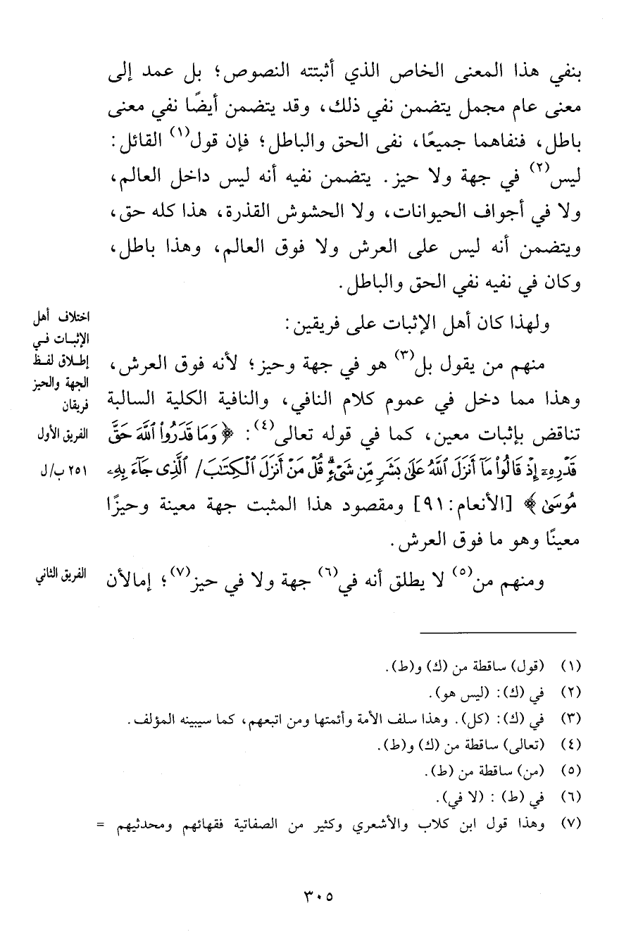بنفي هذا المعنى الخاص الذي أثبتته النصوص بل عمد إلى معنى عام مجمل يتضمن نفي ذلك وقد يتضمن أيضًا نفي معنى باطل فنفاهما جميعًا نفى الحق والباطل فإن قول القائل ليس في جهة ولا حيز يتضمن نفيه أنه ليس داخل العالم ولا في أجواف الحيوانات ولا الحشوش القذرة هذا كله حق ويتضمن أنه ليس على العرش ولا فوق العالم وهذا باطل وكان في نفيه نفي الحق والباطل ولهذا كان أهل الإثبات على فريقين منهم من يقول بل هو في جهة وحيز لأنه فوق العرش وهذا مما دخل في عموم كلام النافي والنافية الكلية السالبة تناقض بإثبات معين كما في قوله تعالى وَمَا قَدَرُواْ اللهَ حَقَّ قَدْرِهِ إِذْ قَالُواْ مَا أَنزَلَ اللهُ عَلَى بَشَرٍ مِّن شَيْءٍ قُلْ مَنْ أَنزَلَ الْكِتَابَ الَّذِي جَاء بِهِ مُوسَى [الأنعام 91] ومقصود هذا المثبت جهة معينة وحيزًا معينًا وهو ما فوق العرش ومنهم من لا يطلق أنه في جهة ولا في حيز إمالأن