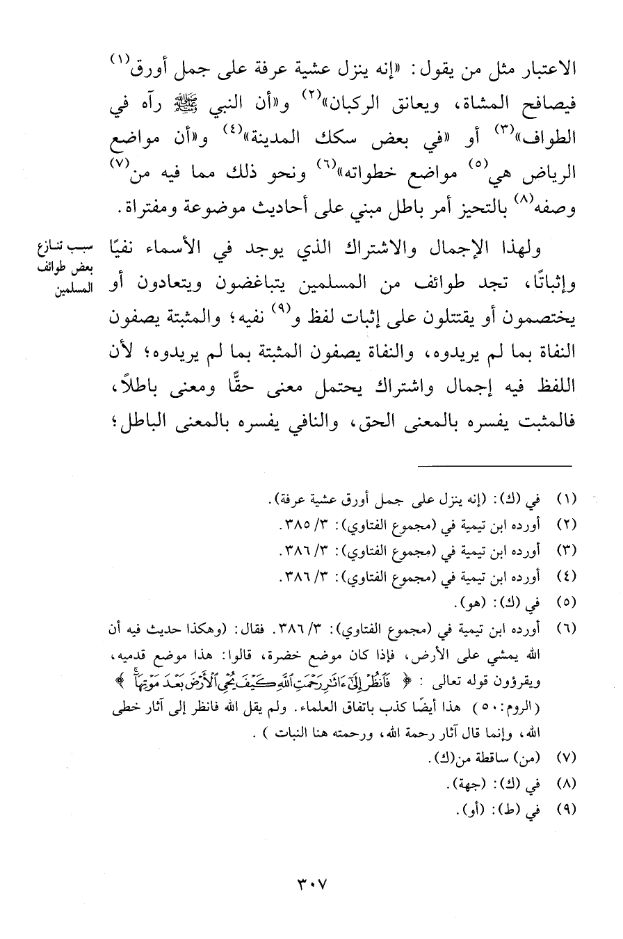 الاعتبار مثل من يقول إنه ينزل عشية عرفة على جمل أورق فيصافح المشاة ويعانق الركبان وأن النبي صلى الله عليه وسلم رآه في الطواف أو في بعض سكك المدينة وأن مواضع الرياض هي مواضع خطواته ونحو ذلك مما فيه من وصفه بالتحيز أمر باطل مبني على أحاديث موضوعة ومفتراة ولهذا الإجمال والاشتراك الذي يوجد في الأسماء نفيًا وإثباتًا تجد طوائف من المسلمين يتباغضون ويتعادون أو يختصمون أو يقتتلون على إثبات لفظ ونفيه والمثبتة يصفون النفاة بما لم يريدوه والنفاة يصفون المثبتة بما لم يريدوه لأن اللفظ فيه إجمال واشتراك يحتمل معنى حقًّا ومعنى باطلاً فالمثبت يفسره بالمعنى الحق والنافي يفسره بالمعنى الباطل