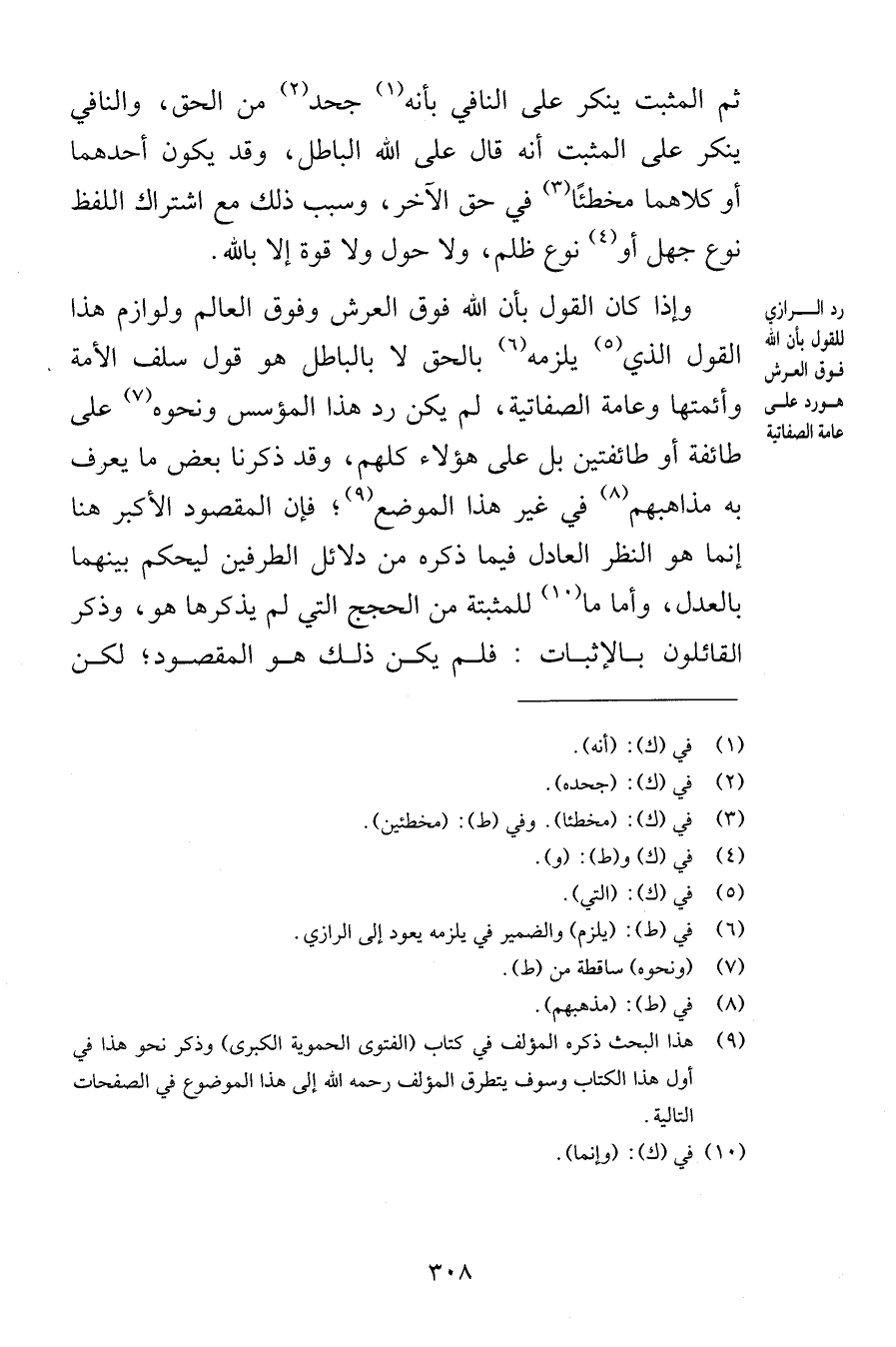 ثم المثبت ينكر على النافي بأنه جحد من الحق والنافي ينكر على المثبت أنه قال على الله الباطل وقد يكون احدهما أو كلاهما مخطئًا في حق الآخر وسبب ذلك مع اشتراك اللفظ نوع جهل أو نوع ظلم ولا حول ولا قوة إلا بالله وإذا كان القول بأن الله فوق العرش وفوق العالم ولوازم هذا القول الذي يلزمه بالحق لا بالباطل هو قول سلف الأمة وأئمتها وعامة الصفاتية لم يكن رد هذا المؤسس ونحوه على طائفة أو طائفتين بل على هؤلاء كلهم وقد ذكرنا بعض ما يعرف به مذاهبهم في غير هذا الموضع فإن المقصود الأكبر هنا إنماهو النظر العادل فيما ذكره من دلائل الطرفين ليحكم بينهما بالعدل وأما ما للمثبتة من الحجج التي لم يذكرها هو وذكر القائلون بالإثبات فلم يكن ذلك هو المقصود لكن