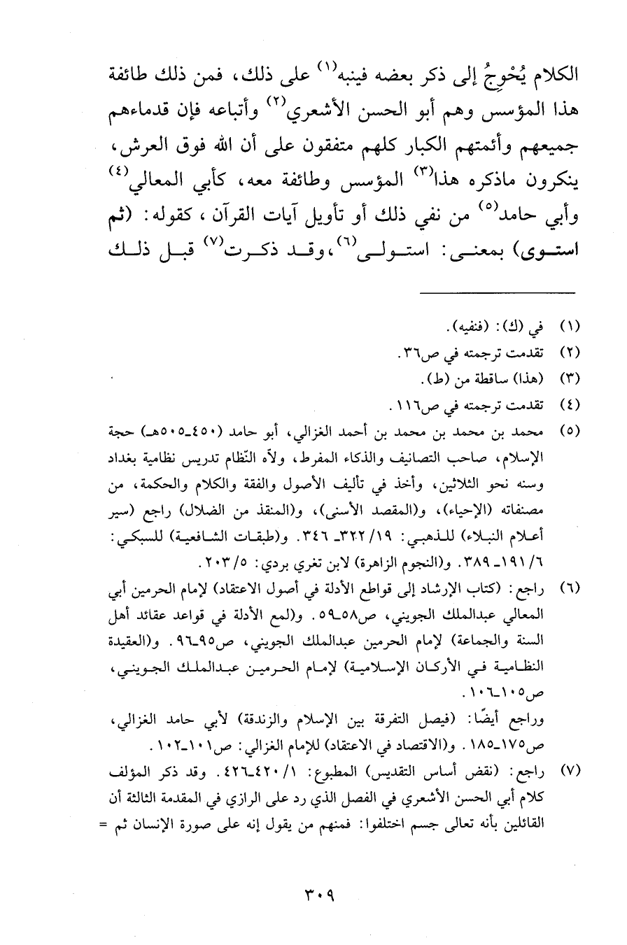 الكلام يُحْوِجُ إلى ذكر بعضه فينبه على ذلك فمن ذلك طائفة هذا المؤسس وهم أبو الحسن الأشعري وأتباعه فإن قدماءهم جميعهم وأئمتهم الكبار كلهم متفقون على أن الله فوق العرش ينكرون ماذكره هذا المؤسس وطائفة معه كأبي المعالي وأبي حامد من نفي ذلك أو تأويل آيات القرآن كقوله ثم استوى بمعنى استولى وقد ذكرت قبل ذلك