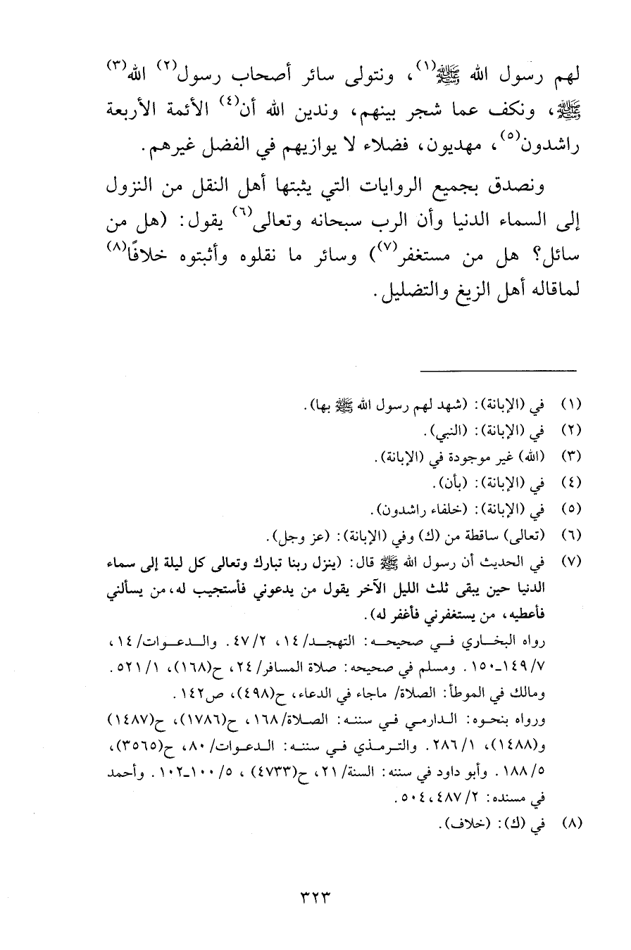 لهم رسول الله صلى الله عليه وسلم ونتولى سائر أصحاب رسول الله صلى الله عليه وسلم ونكف عما شجر بينهم وندين الله أن الأئمة الأربعة راشدون مهديون فضلاء لا يوازيهم في الفضل غيرهم ونصدق بجميع الروايات التي يثبتها أهل النقل من النزول إلى السماء الدنيا وأن الرب سبحانه وتعالى يقول هل من سائل هل من مستغفر وسائر ما نقلوه وأثبتوه خلافًا لماقاله أهل الزيغ والتضليل