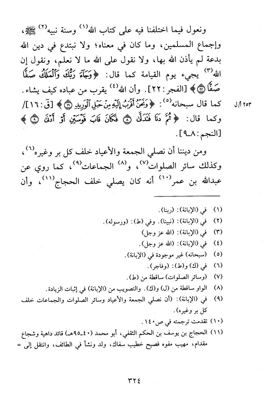 ونعول فيما اختلفنا فيه على كتاب الله وسنة نبيه صلى الله عليه وسلم وإجماع المسلمين وما كان في معناه ولا نبتدع في دين الله بدعة لم يأذن الله بها ولا نقول على الله ما لا نعلم ونقول إن الله يجيء يوم القيامة كما قال وَجَاء رَبُّكَ وَالْمَلَكُ صَفّاً صَفّاً {22} [الفجر 22] وأن الله يقرب من عباده كيف يشاء كما قال سبحانه وَنَحْنُ أَقْرَبُ إِلَيْهِ مِنْ حَبْلِ الْوَرِيدِ {16} [ق 16] وكما قال ثُمَّ دَنَا فَتَدَلَّى {8} فَكَانَ قَابَ قَوْسَيْنِ أَوْ أَدْنَى {9} [النجم 8-9] ومن ديننا أن نصلي الجمعة والأعياد خلف كل بر وغيره وكذلك سائر الصلوات والجماعات كما روي عن عبد الله بن عمر أنه كان يصلي خلف الحجاج وأن