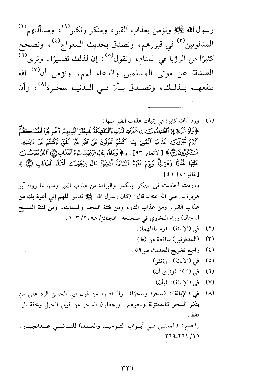 رسول الله صلى الله عليه وسلم ونؤمن بعذاب القبر ومنكر ونكير ومسألتهم المدفونين في قبورهم ونصدق بحديث المعراج ونصحح كثيرًا من الرؤيا في المنام ونقول إن لذلك تفسيرًا ونرى الصدقة عن موتى المسلمين والدعاء لهم ونؤمن أن الله ينفعهم بذلك ونصدق بأن في الدنيا سحرة وأن