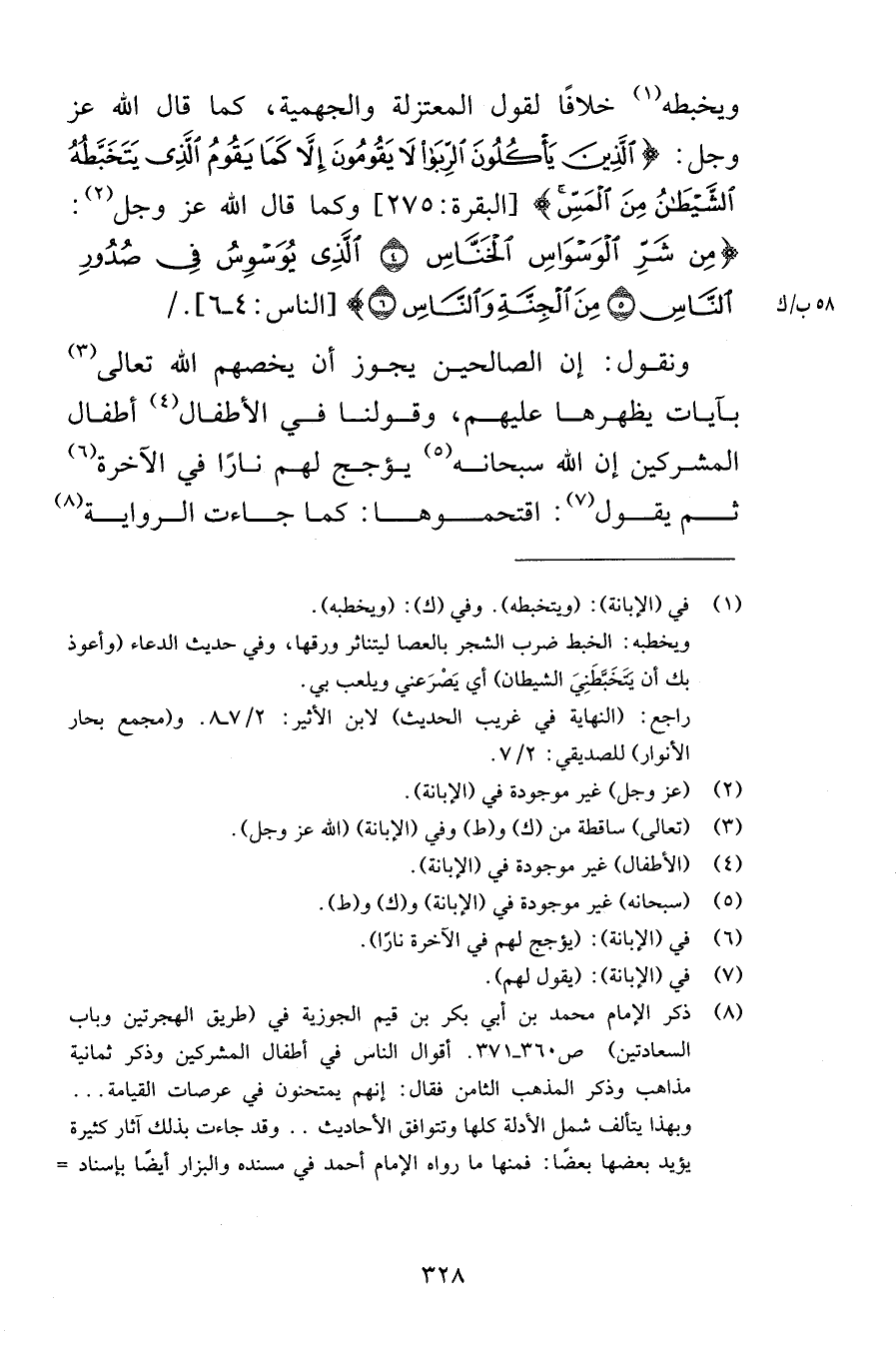 ويخبطه خلافًا لقول المعتزلة والجهمية كما قال الله عز وجل الَّذِينَ يَأْكُلُونَ الرِّبَا لاَ يَقُومُونَ إِلاَّ كَمَا يَقُومُ الَّذِي يَتَخَبَّطُهُ الشَّيْطَانُ مِنَ الْمَسِّ [البقرة 275] وكما قال الله عز وجل مِن شَرِّ الْوَسْوَاسِ الْخَنَّاسِ {4} الَّذِي يُوَسْوِسُ فِي صُدُورِ النَّاسِ {5} مِنَ الْجِنَّةِ وَالنَّاسِ {6} [الناس 4-6] ونقول إن الصالحين يجوز أن يخصهم الله تعالى بآيات يظهرها عليهم وقولنا في الأطفال أطفال المشركين إن الله سبحانه يؤجج لهم نارًا في الآخرة ثم يقول اقتحموها كما جاءت الرواية