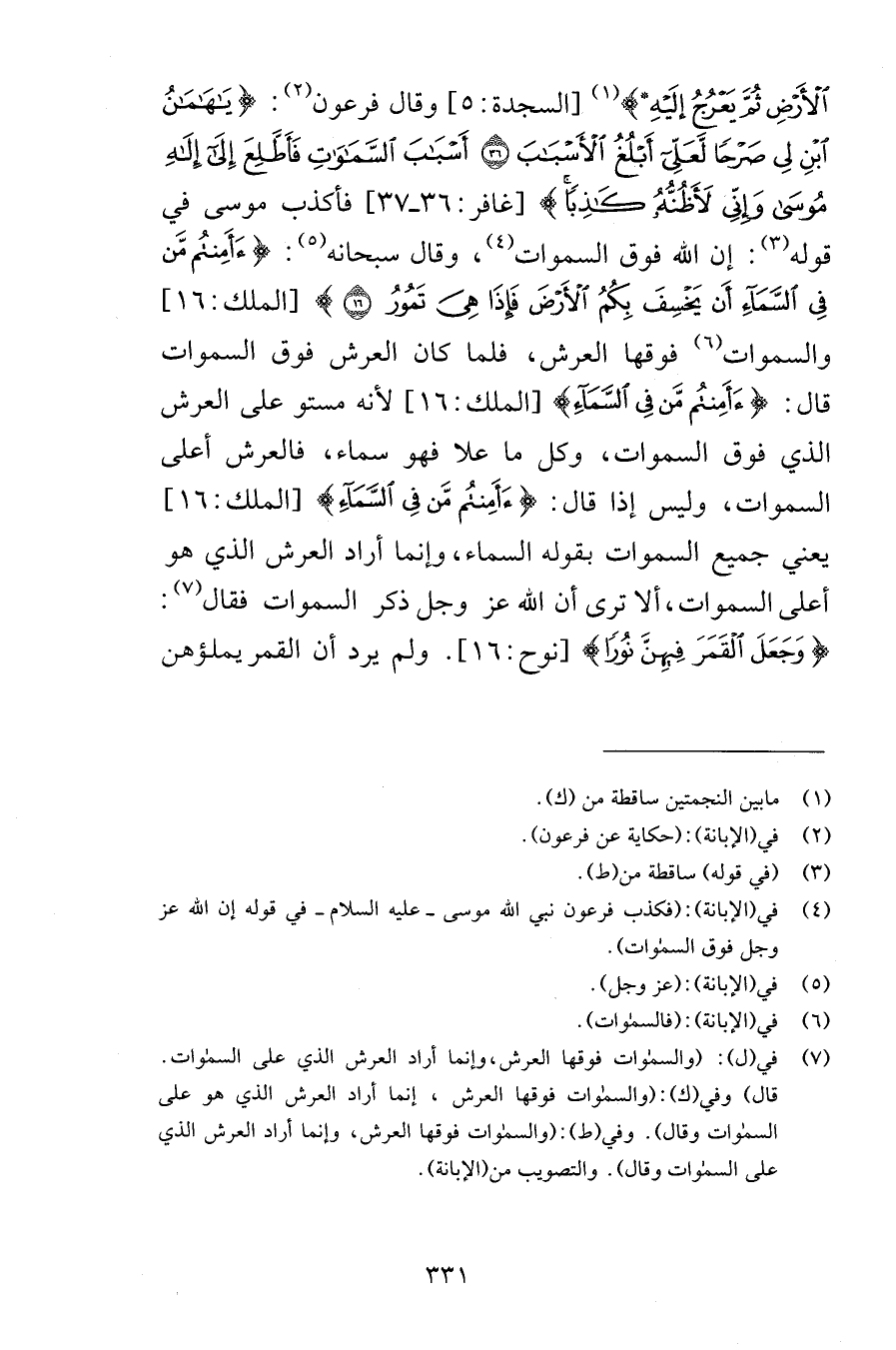 الْأَرْضِ ثُمَّ يَعْرُجُ إِلَيْهِ [السجدة 5] وقال فرعون يَا هَامَانُ ابْنِ لِي صَرْحاً لَّعَلِّي أَبْلُغُ الْأَسْبَابَ {36} أَسْبَابَ السَّمَاوَاتِ فَأَطَّلِعَ إِلَى إِلَهِ مُوسَى وَإِنِّي لَأَظُنُّهُ كَاذِباً [غافر 36-37] فأكذب موسى في قوله إن الله فوق السموات وقال سبحانه أَأَمِنتُم مَّن فِي السَّمَاء أَن يَخْسِفَ بِكُمُ الأَرْضَ فَإِذَا هِيَ تَمُورُ {16} [الملك 16] والسموات فوقها العرش فلما كان العرش فوق السموات قال أَأَمِنتُم مَّن فِي السَّمَاء [الملك 16] لأنه مستو على العرش الذي فوق السموات وكل ما علا فهو سماء فالعرش أعلى السموات وليس إذا قال أَأَمِنتُم مَّن فِي السَّمَاء [الملك 16] يعني جميع السماء بقوله السماء وإنما أراد العرش الذي هو أعلى السموات ألا ترى أن الله عز وجل ذكر السموات فقال وَجَعَلَ الْقَمَرَ فِيهِنَّ نُوراً [نوح 16] ولم يرد أن القمر يملؤهن