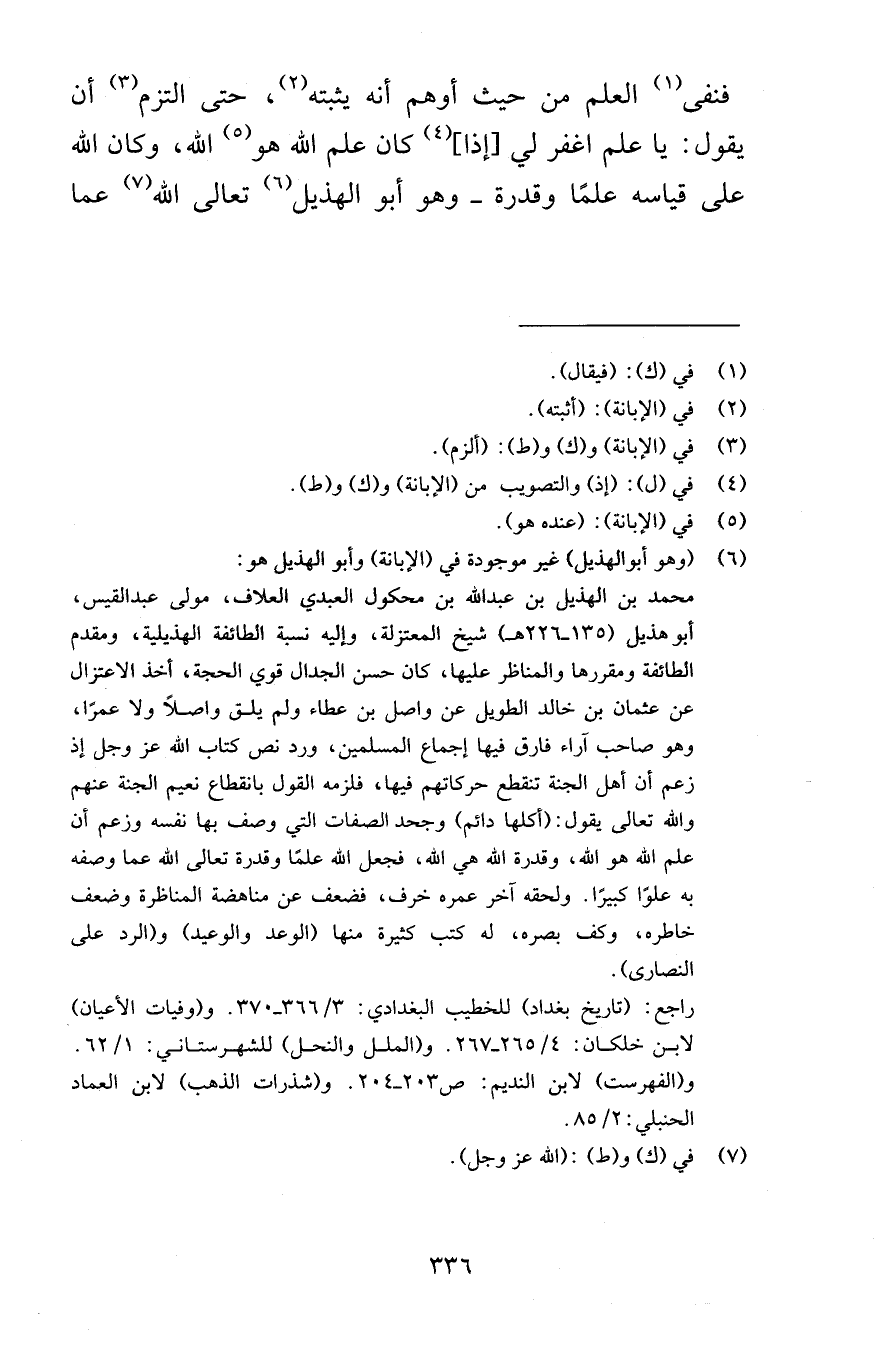 فنفى العلم من حيث أوهم أنه يثبته حتى التزم أن يقول يا علم اغفر لي إذا كان علم الله هو الله وكان الله على قياسه علمًا وقدرة وهو أبو الهذيل تعالى الله عما