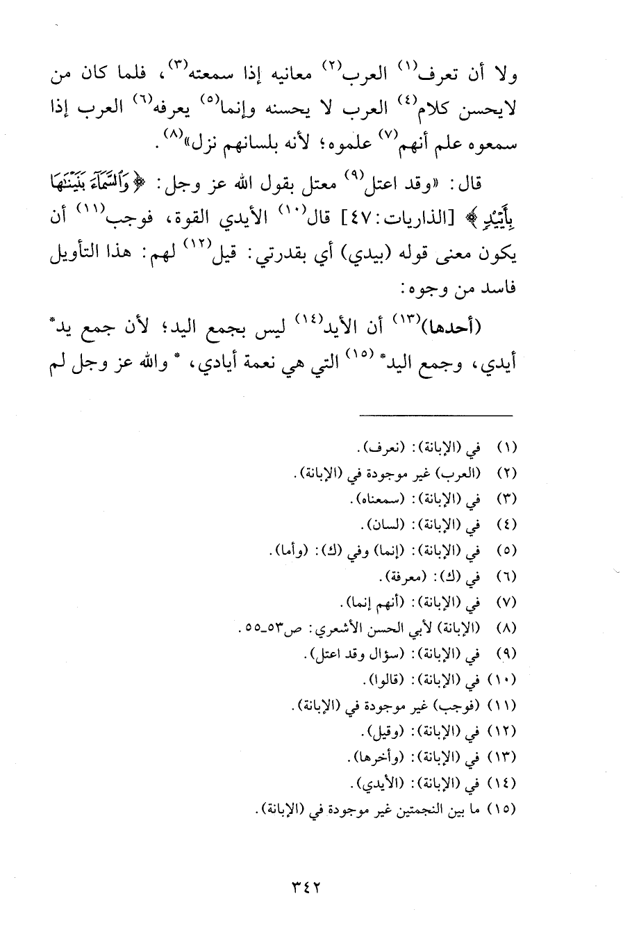 ولا أن تعرف العرب معانيه إذا سمعته فلما كان من لايحسن كلام العرب لا يحسنه وإنما يعرفه العرب إذا سمعوه علم أنهم علموه لأنه بلسانهم نزل قال وقد اعتل معتل بقول الله عز وجل وَالسَّمَاء بَنَيْنَاهَا بِأَيْدٍ [الذاريات 47] قال الأيدي القوة فوجب أن يكون معنى قوله بيدي أي بقدرتي قيل لهم هذا التأويل فاسد من وجوه أحدها أن الأيد ليس بجمع اليد لأن جمع يد أيدي وجمع اليد التي هي نعمة أيادي والله عز وجل لم