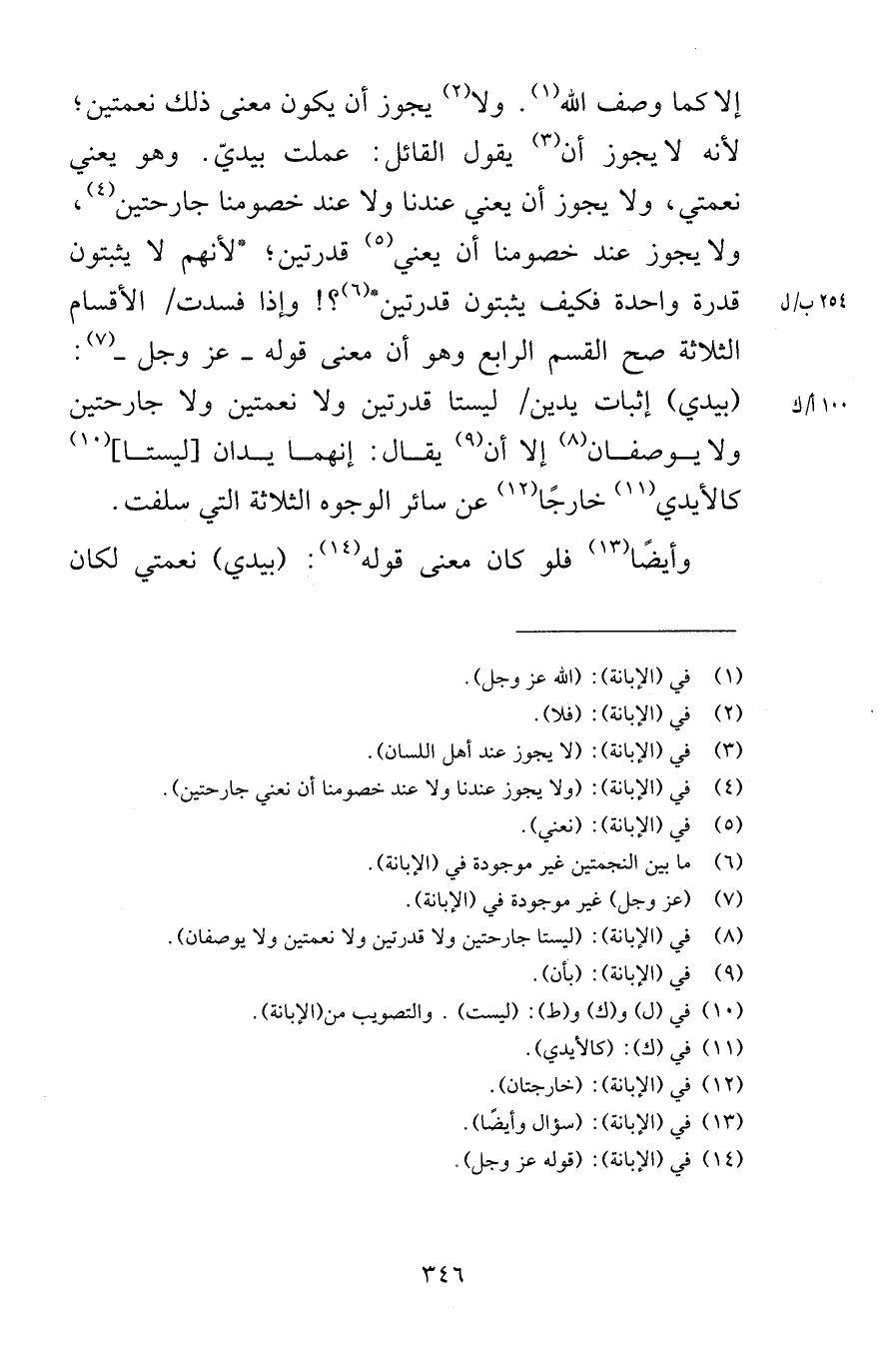 إلا كما وصف الله ولا يجوز أن يكون معنى ذلك نعمتين لأنه لا يجوز أن يقول القائل عملت بيديّ وهو يعني نعمتي ولا يجوز أن يعني عندنا ولا عند خصومنا جارحتين ولا يجوز عند خصومنا أن يعني قدرتين لأنهم لا يثبتون قدرة واحدة فكيف يثبتون قدرتين وإذا فسدت الأقسام الثلاثة صح القسم الرابع وهو أن معنى قوله عز وجل بيدي إثبات يدين ليستا قدرتين ولا نعمتين ولا جارحتين ولا يوصفان إلا أن يقال إنهما يدان ليستا كالأيدي خارجًا عن سائر الوجوه الثلاثة التي سلفت وأيضًا فلو كان معنى قوله بيدي نعمتي لكان
